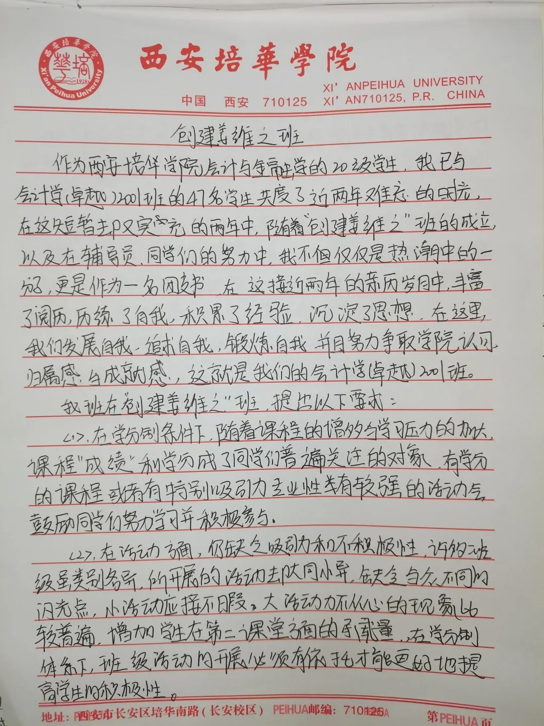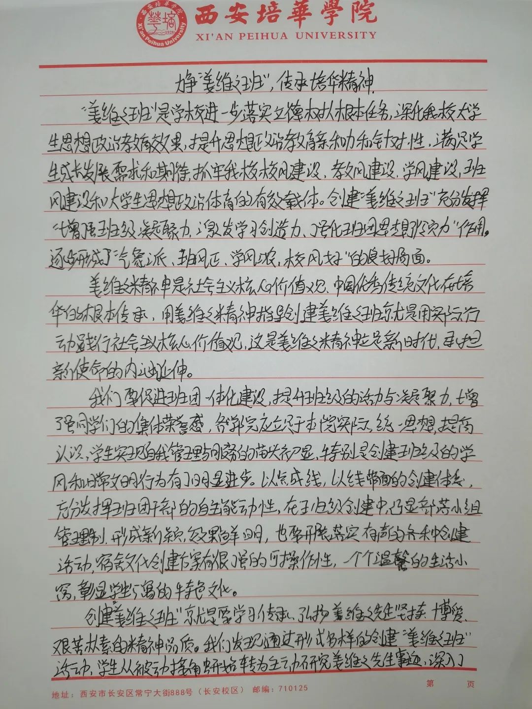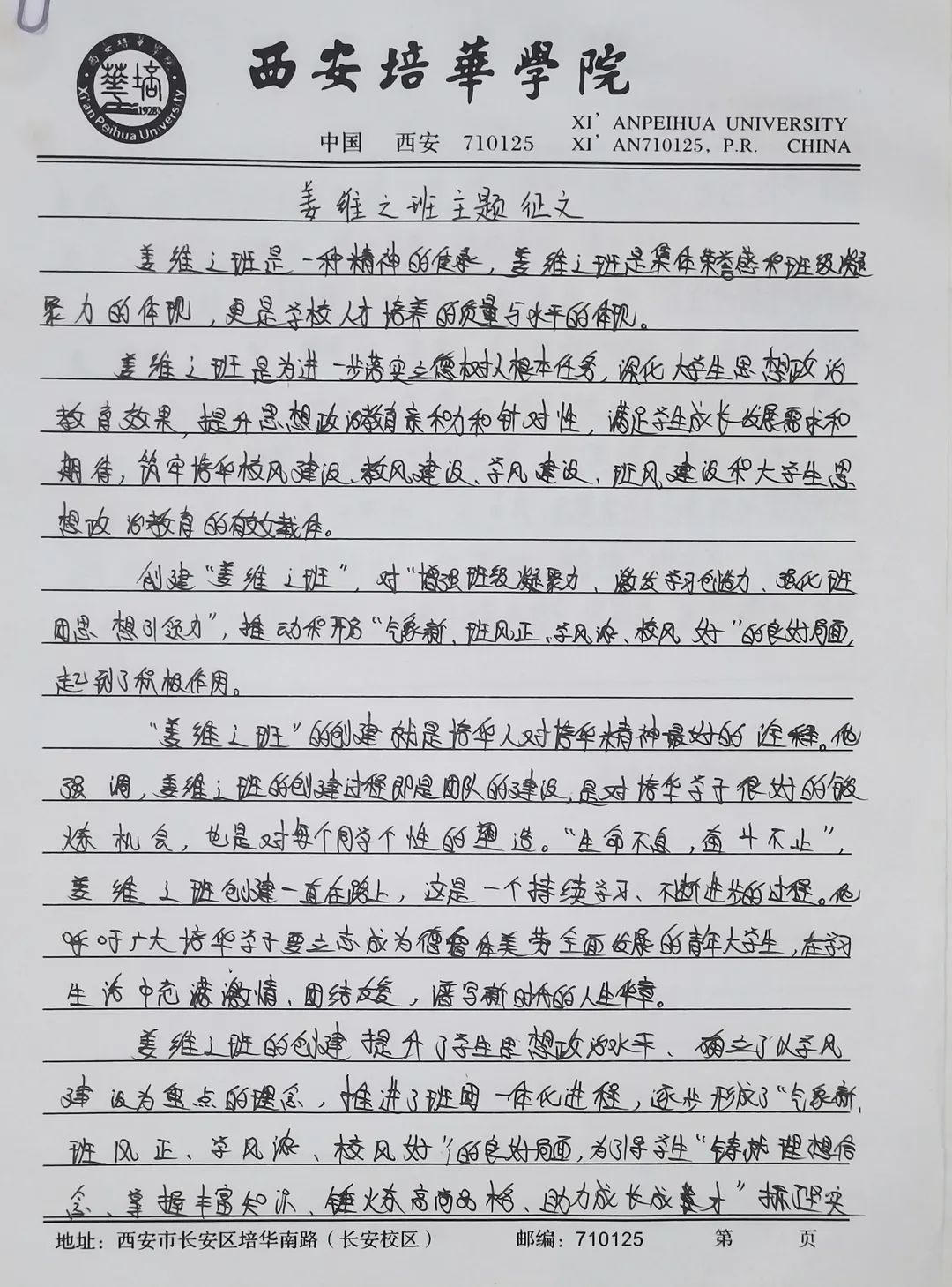 我们要争做时代新青年,成为⼀个有理想,有毅⼒的培华学子,⼀个人要拥有坚定的理想,强大的毅力,同时有作为,敢担当,用科学的的力量,用文化的知识武装自己,早日成为⼀个建设祖国未来繁荣发展的优秀接班⼈。同时,建设“姜维之班”又是学校教育的一大特色,开展“姜维之班”的建设,主要目的便是希望各学院可以立足实际,统一思想,提高思想认知,特别是自“姜维之班”建设开展以来,学生们能够严格约束自己,学风建设,日常文明行为得到更⼀步的强化。培养了一大批坚毅刚强,不怕困难,敢与创新的优秀学子。