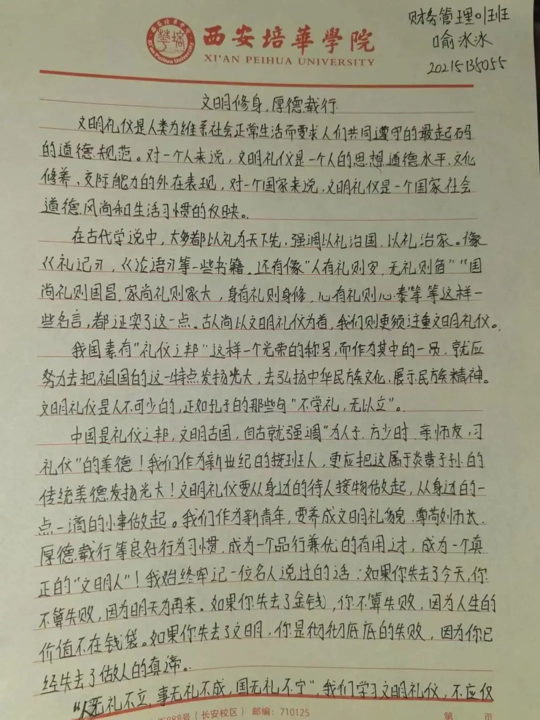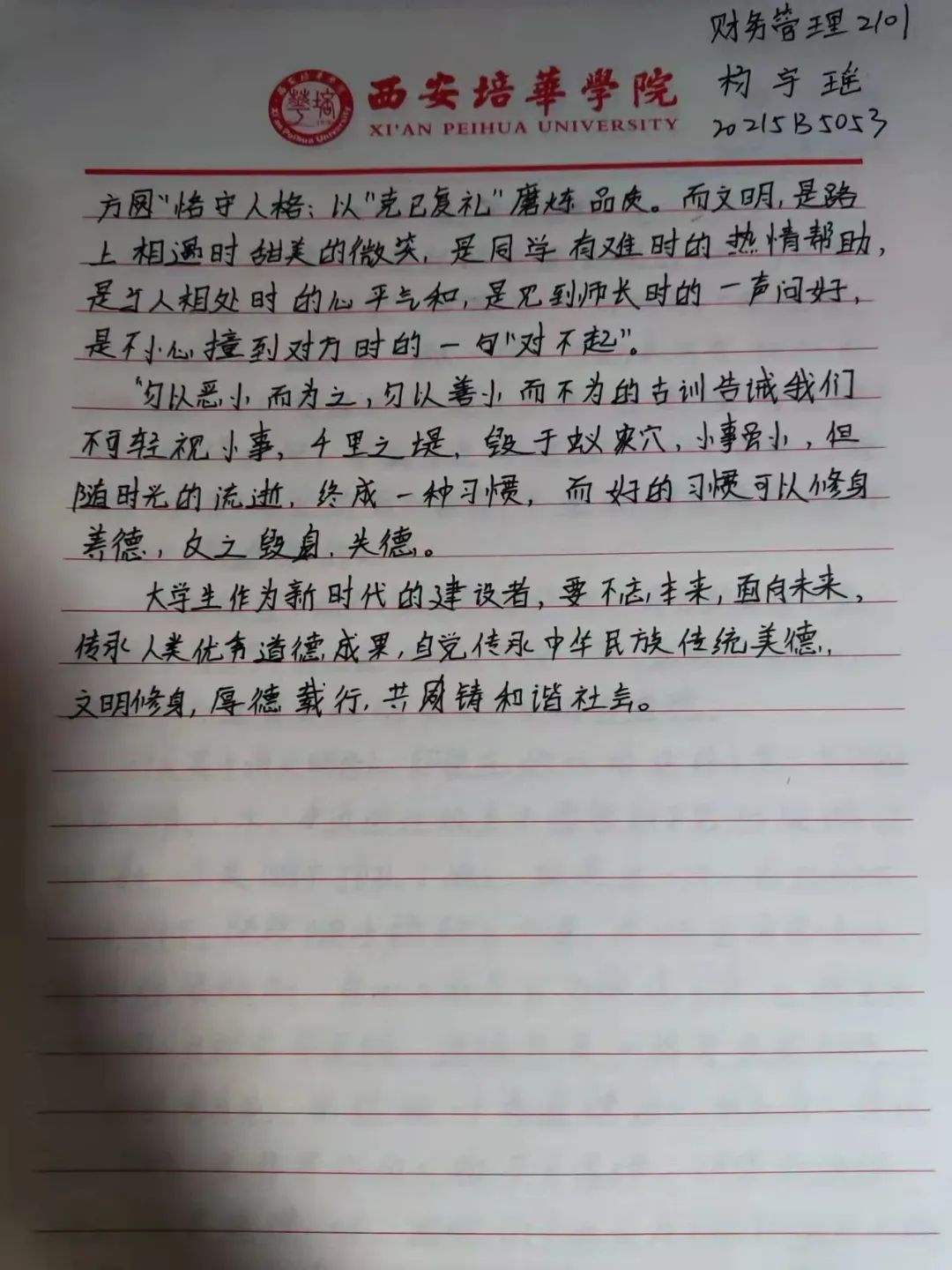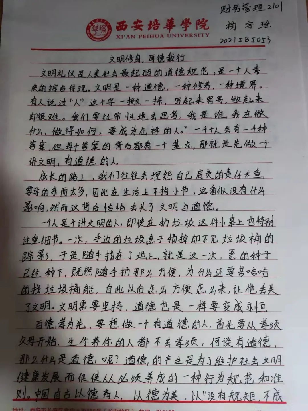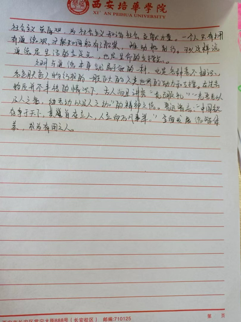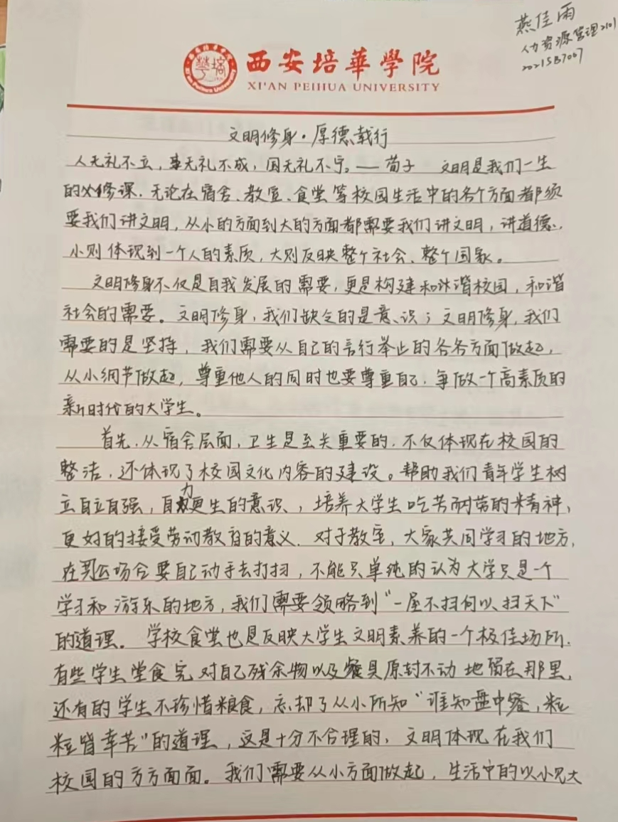 中华民族素来是谦恭礼让的文明礼仪之邦。中华文化博大精深,源远流长。以人为本,以德为先,以人为本,是胡锦涛同志提出的科学发展观的核心,体现了中国共产党全心全意“为人民服务”的根本宗旨。道德是立人之本,有才无德的人便是一个可怕之人,德是做人做事的根本原则,是人们安身于世上最重要的基石。从小的教育让我们知道尊老爱幼,勤俭节约,尊师重道。三人行,必有我师焉,择其善者而从之,其不善者而改之。由此可见修身立德非常重要,作为大学生的我们,要坚定自己的理想信念,以道德准则严格要求自己,树立正确的道德观,以人为本,以德立人。