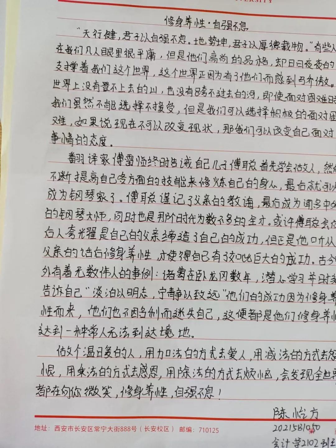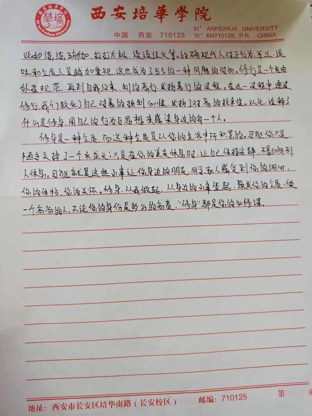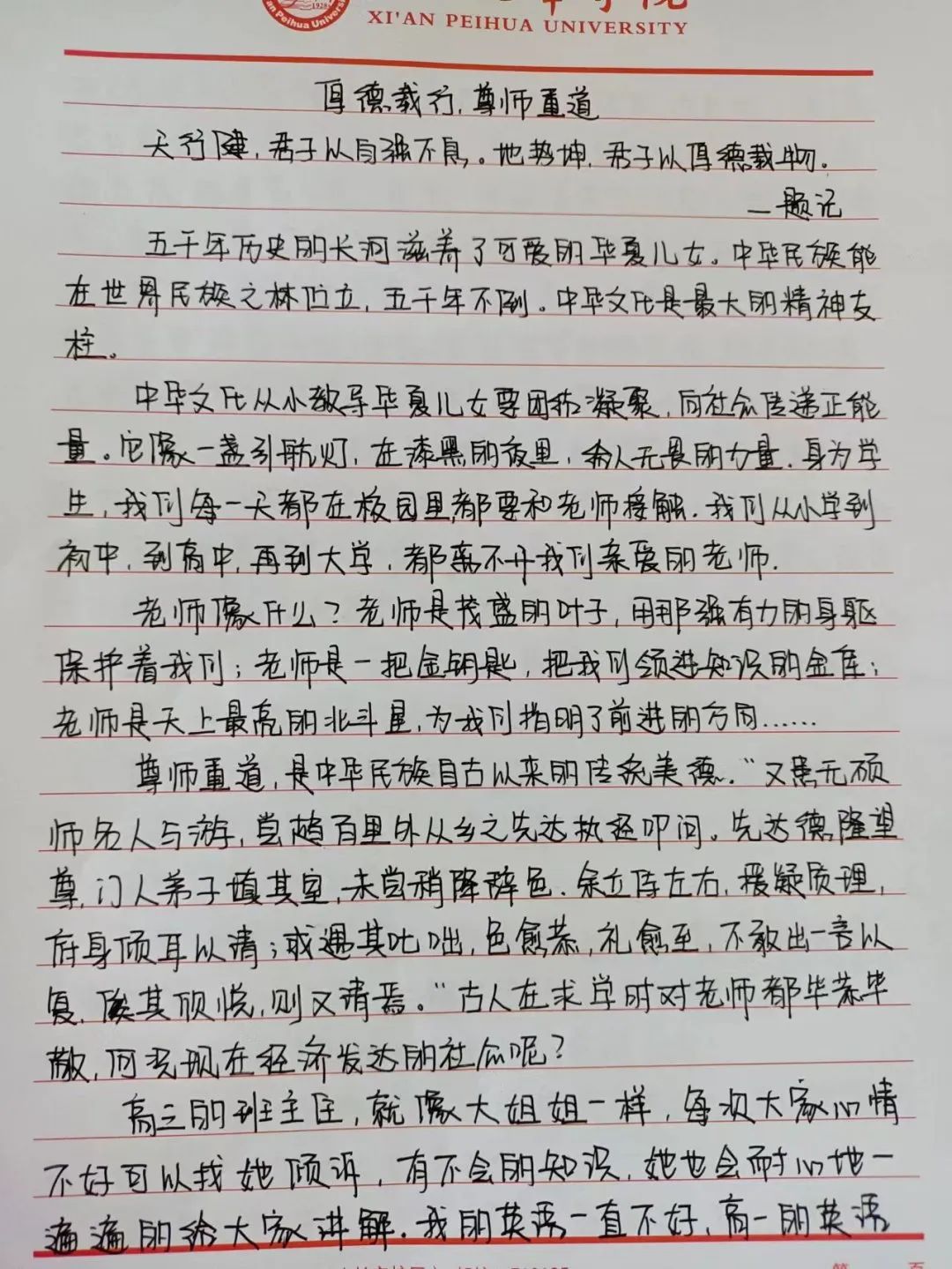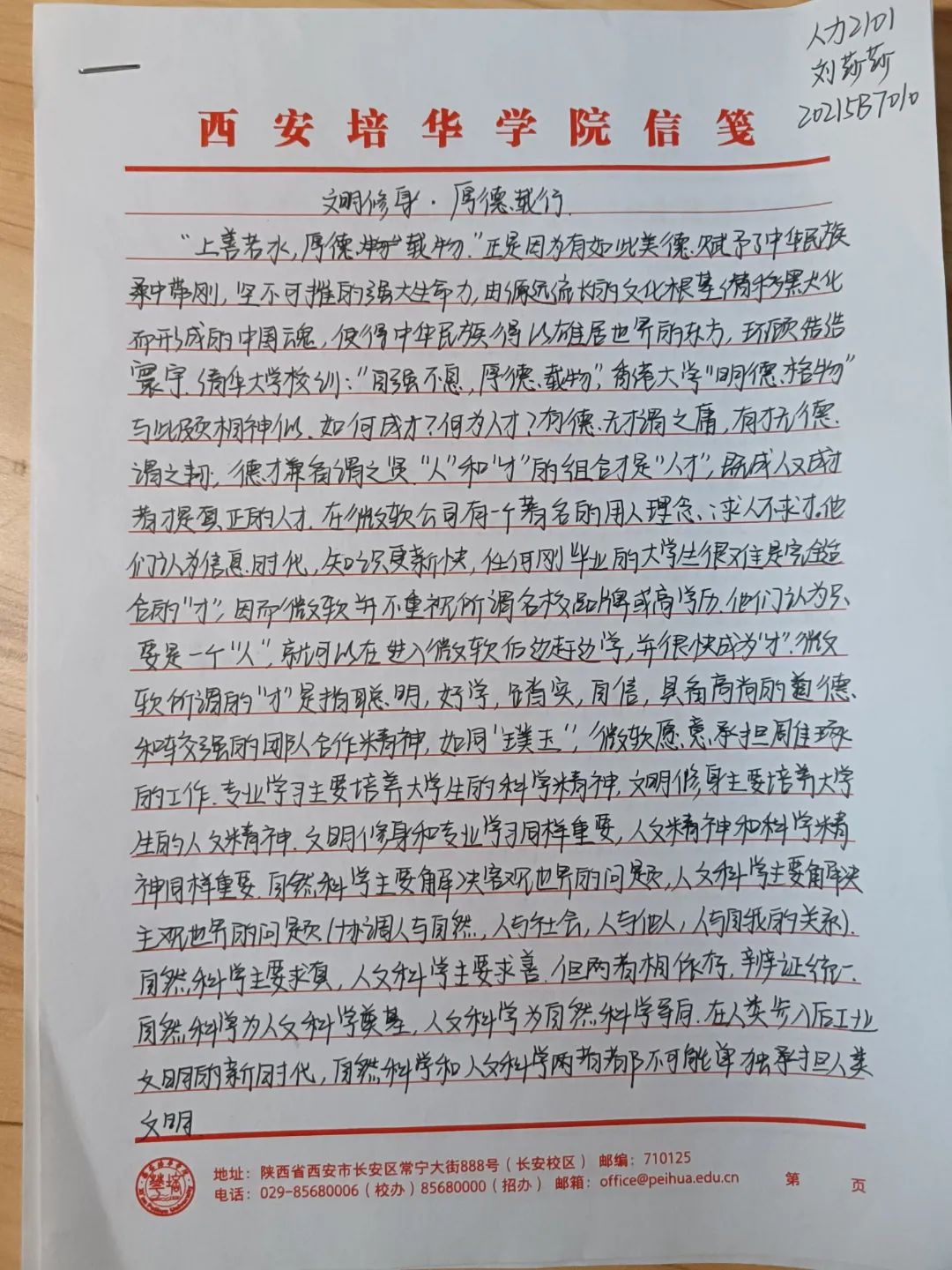 中华民族素来是谦恭礼让的文明礼仪之邦。中华文化博大精深,源远流长。以人为本,以德为先,以人为本,是胡锦涛同志提出的科学发展观的核心,体现了中国共产党全心全意“为人民服务”的根本宗旨。道德是立人之本,有才无德的人便是一个可怕之人,德是做人做事的根本原则,是人们安身于世上最重要的基石。从小的教育让我们知道尊老爱幼,勤俭节约,尊师重道。三人行,必有我师焉,择其善者而从之,其不善者而改之。由此可见修身立德非常重要,作为大学生的我们,要坚定自己的理想信念,以道德准则严格要求自己,树立正确的道德观,以人为本,以德立人。