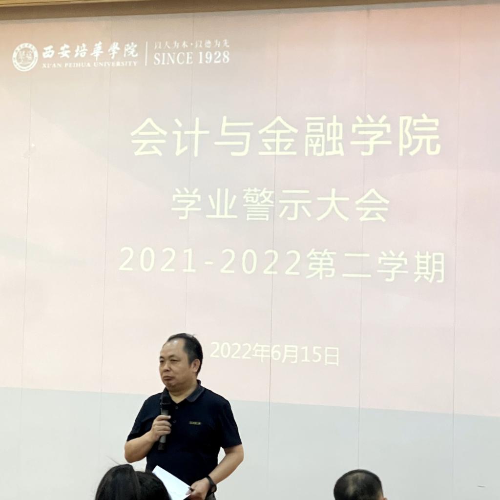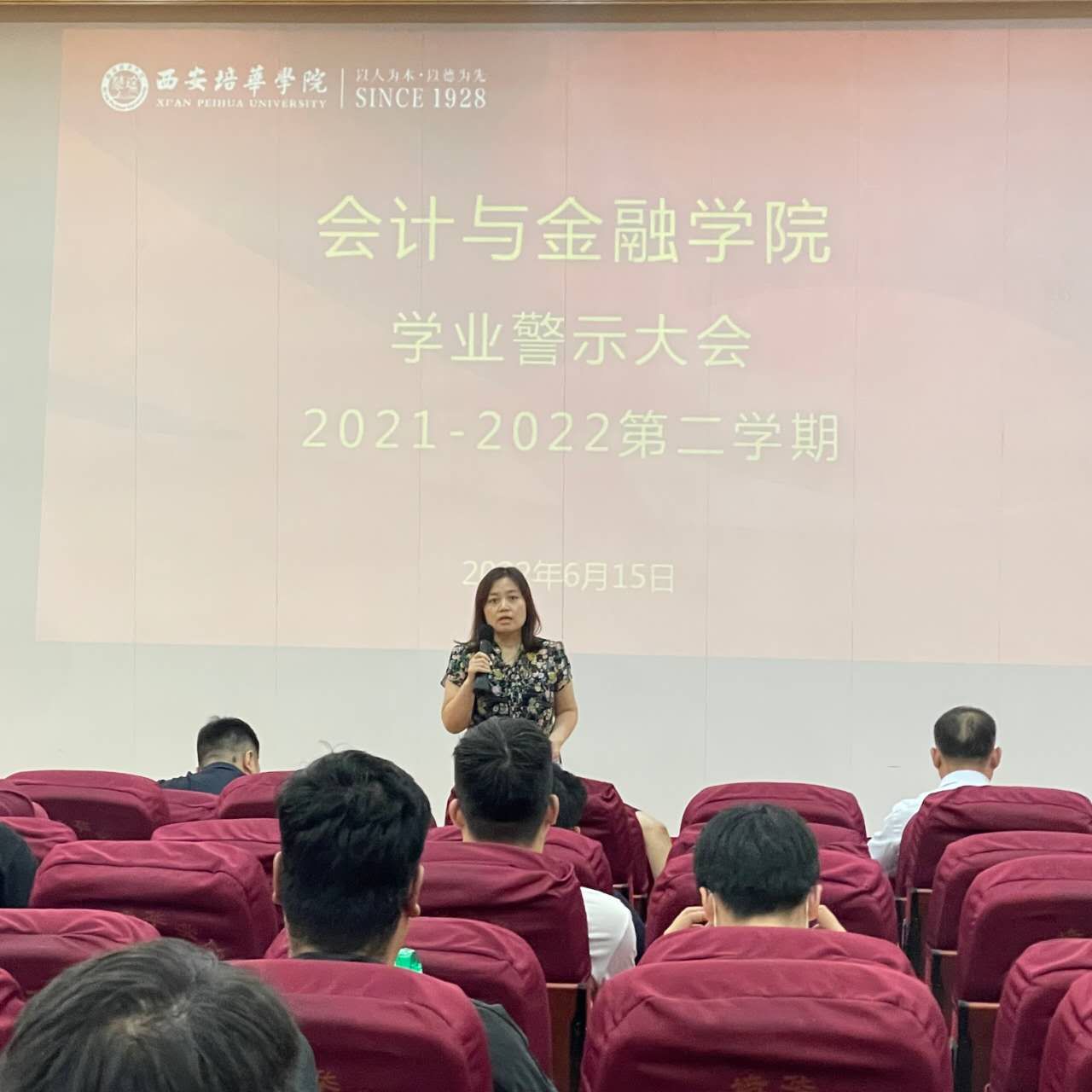 会金学院的2021-2022第二学期学业警示教育工作在赵院长为组长,杨院长史院长为副组长的领导班子带领下,各位学业、生涯导师与每位被预警学生一对一谈话并联系其家长,真正做到了学院、学生、家庭“三结合”。本次学业警示会给全体学生敲响了警钟,促使全体学生端正态度,为我院学生的成才成长和优良学风建设起到了良好的助推作用。