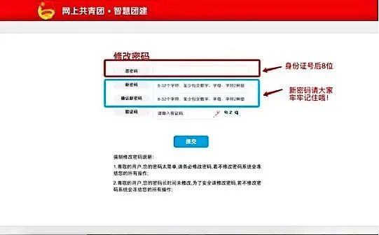 忘记密码的用户可以通过直属上级组织管理员(团支书)提供“重置密码验证码”设置新密码。