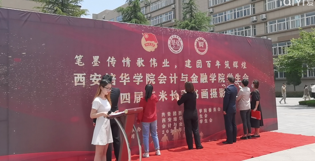为迎接中国共产主义青年团建团100周年,激发同学们的爱国情怀,弘扬共青团精神,坚持不懈奋斗、报效祖国的信念。西安培华学院会计与金融学院学生会于2022年5月19日12:30在综合楼西广场举办第四届“笔墨传情歌伟业,建团百年筑辉煌”百米长卷书画摄影展。