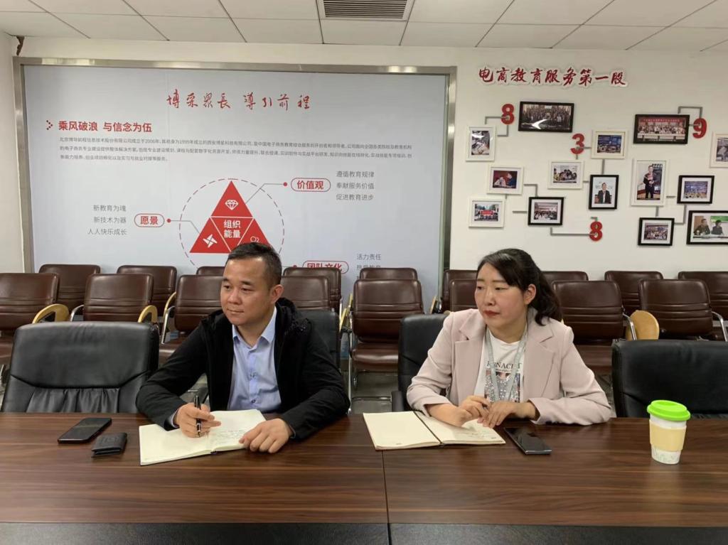 首先,工作人员带领大家参观了公司,详细讲解了公司目前的业务情况。北京博导前程信息技术股份有限公司成立于2006年,前身为1999年成立的西安博星科技有限公司。公司致力于面向全国各类职业院校、应用型本科院校学生和社会的各类人才提供电子商务、商务数据分析、跨境电子商务、农村电子商务、移动商务、网络营销等领域的技能提升综合服务。包括:技术技能人才培训、师资培训、培训标准和资源研发、培训组织和管理等一体化综合服务,并逐步匹配开发、积累形成了大量的培训标准、培训资源、培训实训平台、培训题库系统和考试系统、线上资源支撑平台,积累和形成成熟的培训组织和考核管理的体系,培养了一支培训研发、实施、管理的骨干团队。目前,博导已经为超过5000所院校提供教育支持与服务。