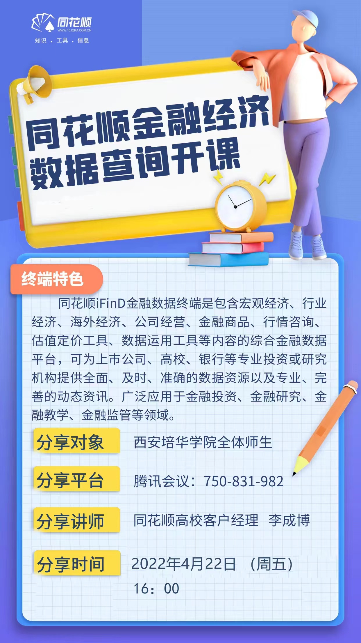 4月22日下午4:00,经济系师生参加了由同花顺公司举办的线上金融经济数据查询公开课。此次课程旨在拓展师生的科创思维,提高学生金融经济知识与实践融合的能力。