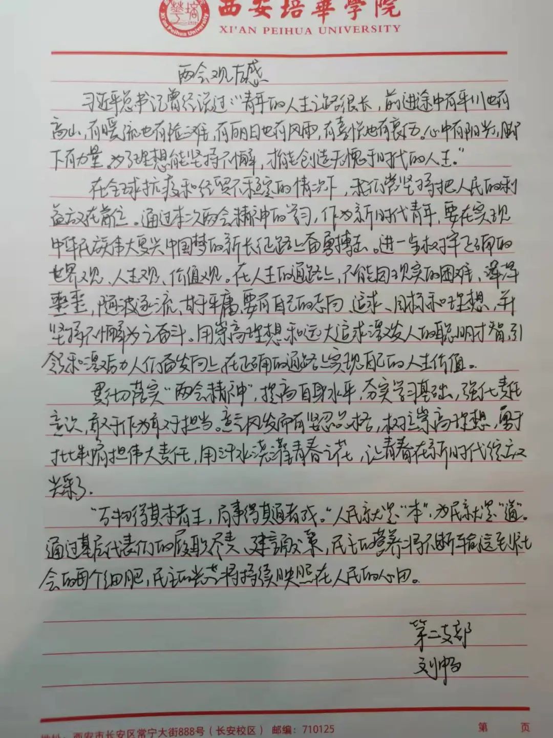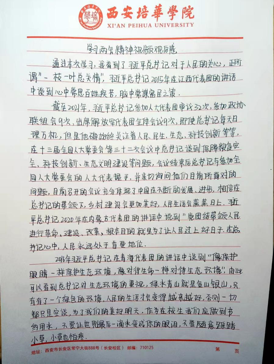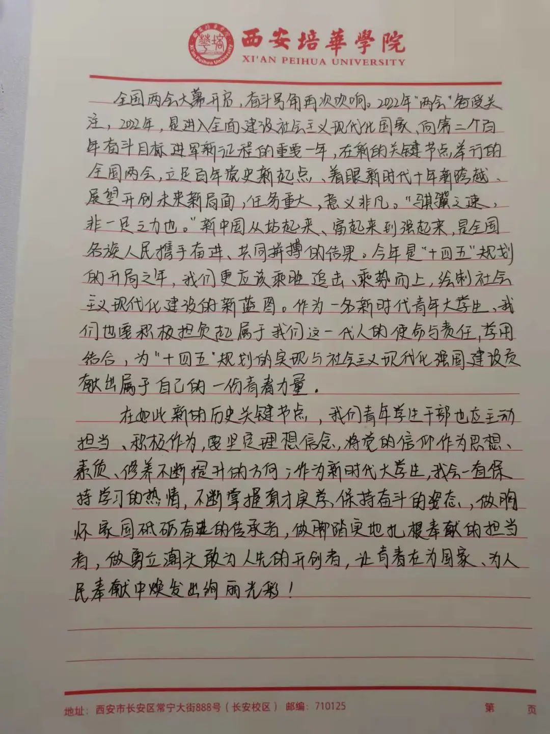 十年全国两会,十个春天的故事。这是思想之光照耀奋进之路。在2022年全国两会举行时,西安培华学院会计与金融学院秉承着伟大思想源自伟大时代,新的理论指导新的实践。以求学问道之心组织党委各支部进行两会观看学习与理解总结。疫情影响下,各个支部也于线上就两会内容进行学习与探讨。各支部同学提交反馈积极更显现出同学们“万山磅礴看主峰,沧海茫茫望灯塔”学习新思想,追随党和国家的爱国情谊。三月的中华大地春和景明,万物复苏。数千名全国人大代表、全国政协委员肩负人民重托和神圣使命齐聚北京,广谋良策、广聚共识、共商大计。在全面建设社会主义现代化国家新的道路上,今年全国两会必将谱写出民主、团结、求实、奋进的崭新篇章,激励亿万人民乘势而上,砥砺前行,向着第二个百年奋斗目标不断迈出坚实步伐。