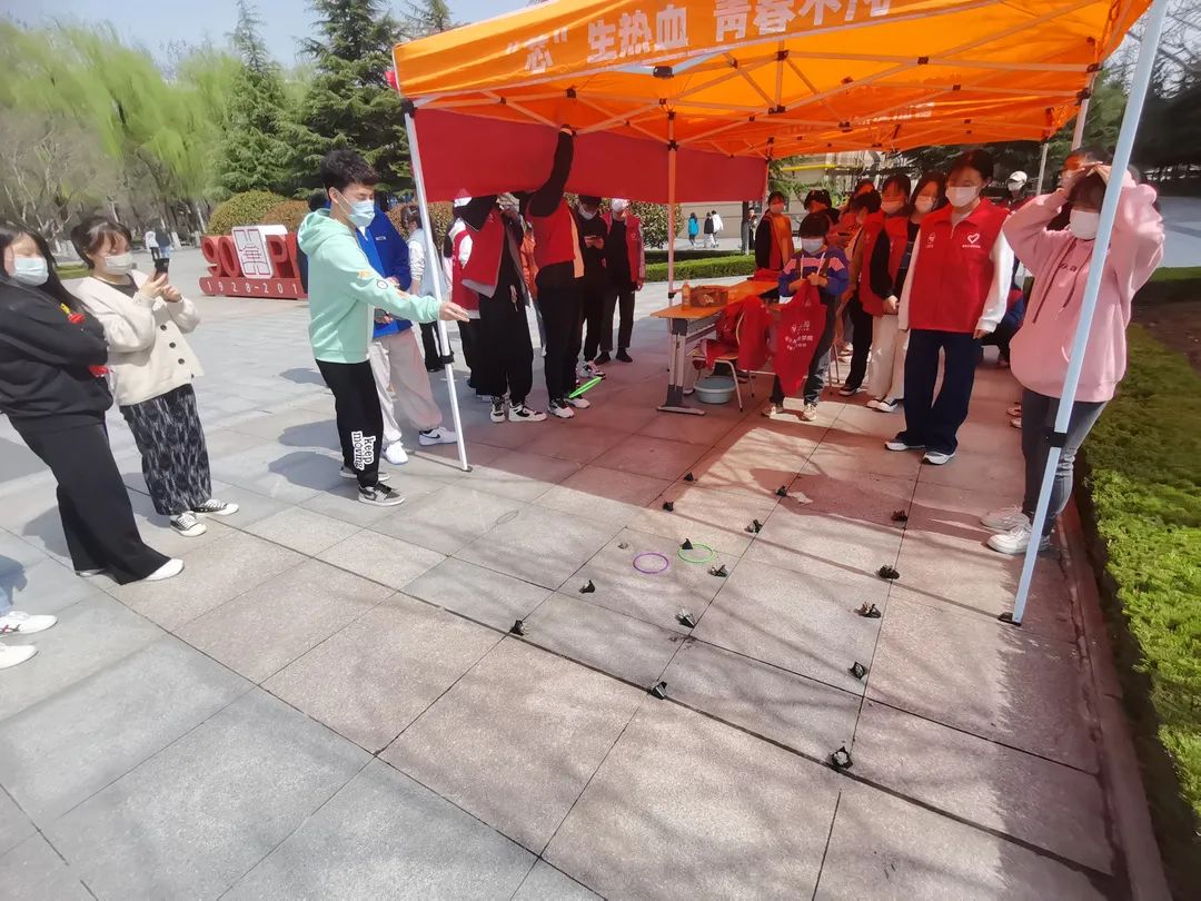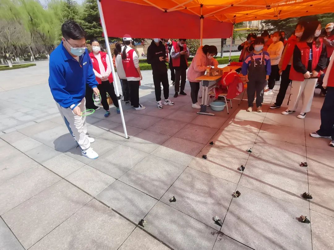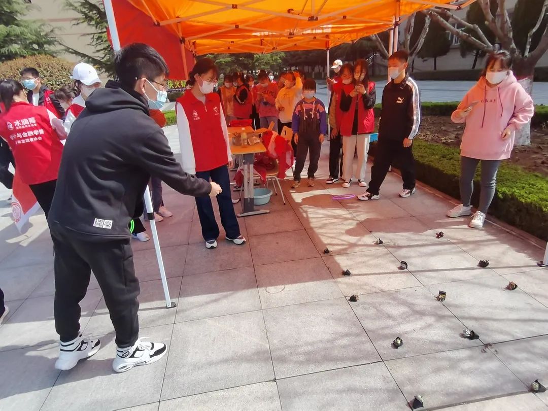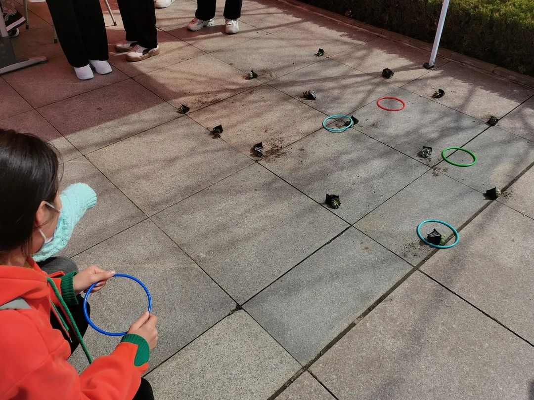 在综合楼西广场的游戏环节中,志愿者们还为同学们准备了套圈小游戏,成功套中的人还将有小礼品相送,同时志愿者们将种子分发给同学们,让同学们带回去栽种。在签PU的过程中志愿者组织大家做好疫情防控,间隔一米距离。