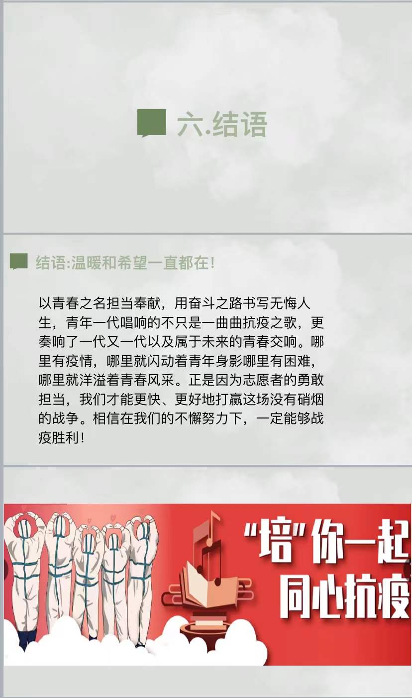此次线上主题教育活动把共同抗击疫情作为推进学校思政教育的重要实践和生动教材,一方面增强了我院师生的疫情防范意识,另一方面激励了全院学子勇挑重担、奉献青春的澎湃激情,在今后的生活中,明确并规划好个人的人生导向,以自己为圆心,传递向上向善向好的青春正能量。