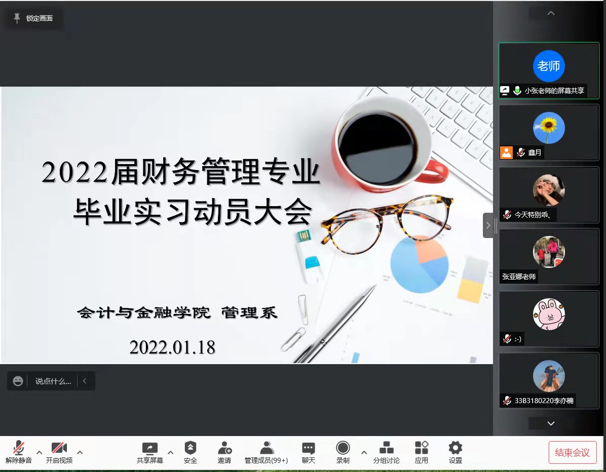 2022年1月18日下午16:00,会计与金融学院财务管理专业2022届毕业实习动员大会通过腾讯会议如期举行。系主任郭琳琳、学科带头人李永红及全体实习指导教师参加了动员大会。同时,2022届毕业生也参加了本次会议。