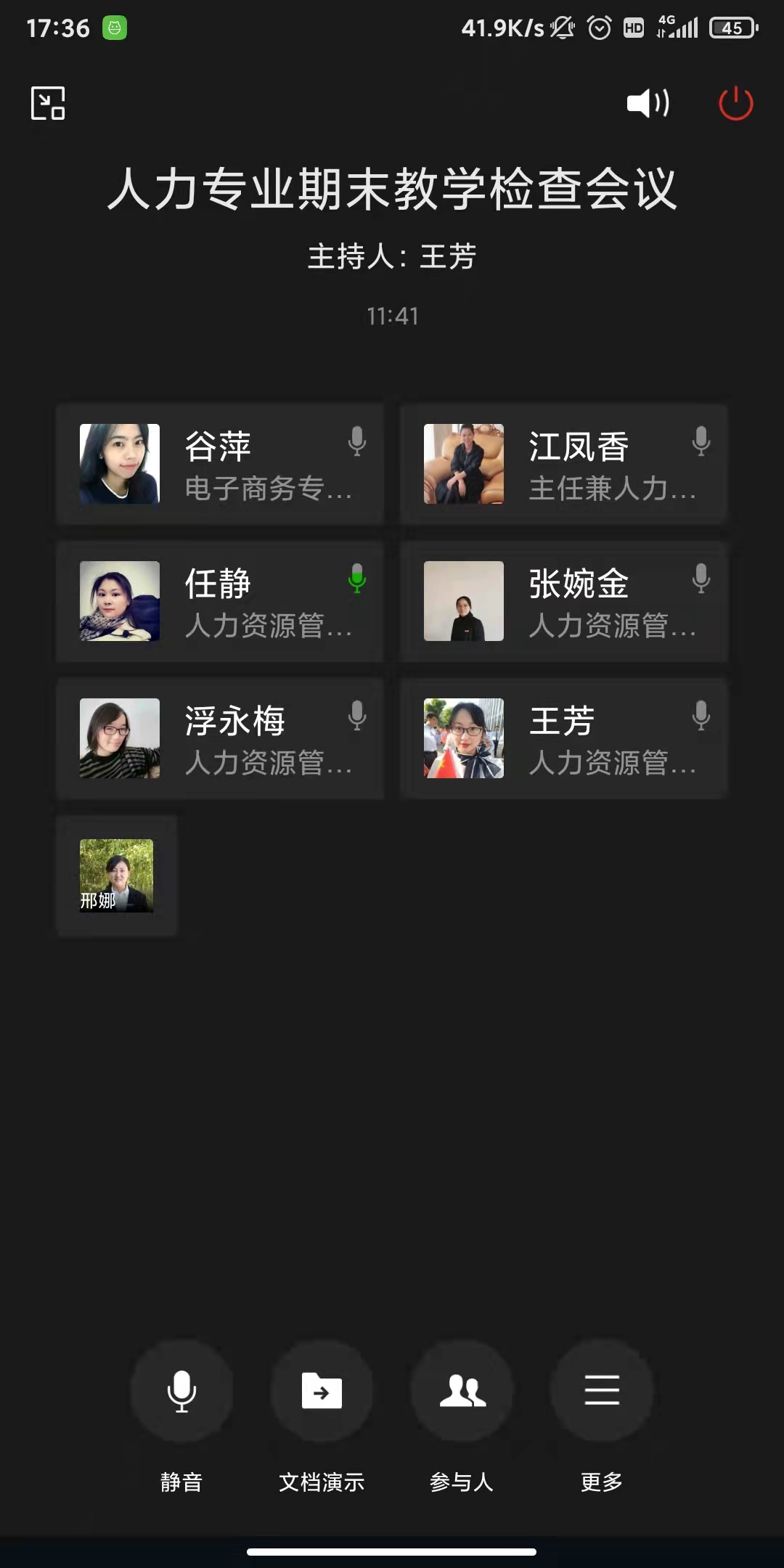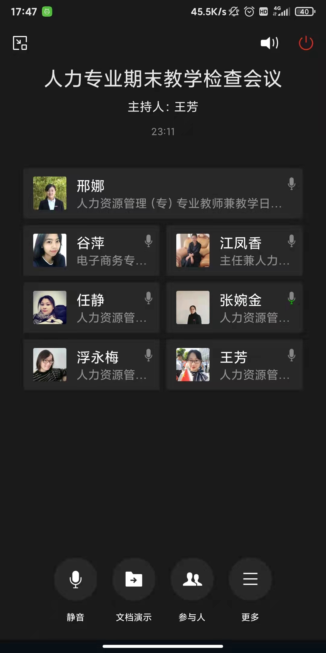 2022年1月13日下午17:00,人力资源管理专业全体教师利用企业微信平台召开关于期末教学检查相关工作的线上会议,专业带头人王芳老师对检查工作的进行详细安排,同时就持续开展的论文指导工作与专业全体教师进行沟通讨论。