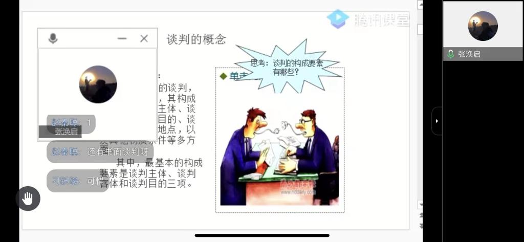 网上教学已顺利进行一周,老师们熟悉线上教学的模式与常规操作,进展顺利。周三关娜老师的第一节课《国际商务谈判实训》,赵选民院长、杨仕鹏副院长、督导组长李永红老师、督导周芳老师全程听课。疫情可以阻断线下教学,却无法阻断知识的传播。20周网上教学将全面铺开,老师们认真准备教学资料,精心设计教学环节,周密部署教学课程,及时组织上课学生,用爱心与耐心坚守在网络教学第一线,为疫情防控和稳定教学做出应有贡献。