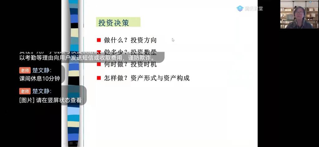 楚文静老师上课中全程开启摄像头,亲切面对学生。严格要求学生上课记笔记、端坐听讲,同宿舍之间互相监督。全程通过简短练习题和学生进行互动,考查学生本届知识点掌握情况。楚老师网络课堂生动有趣,对于公司金融、财经信息的讲解极大地调动了学生学习的积极性。