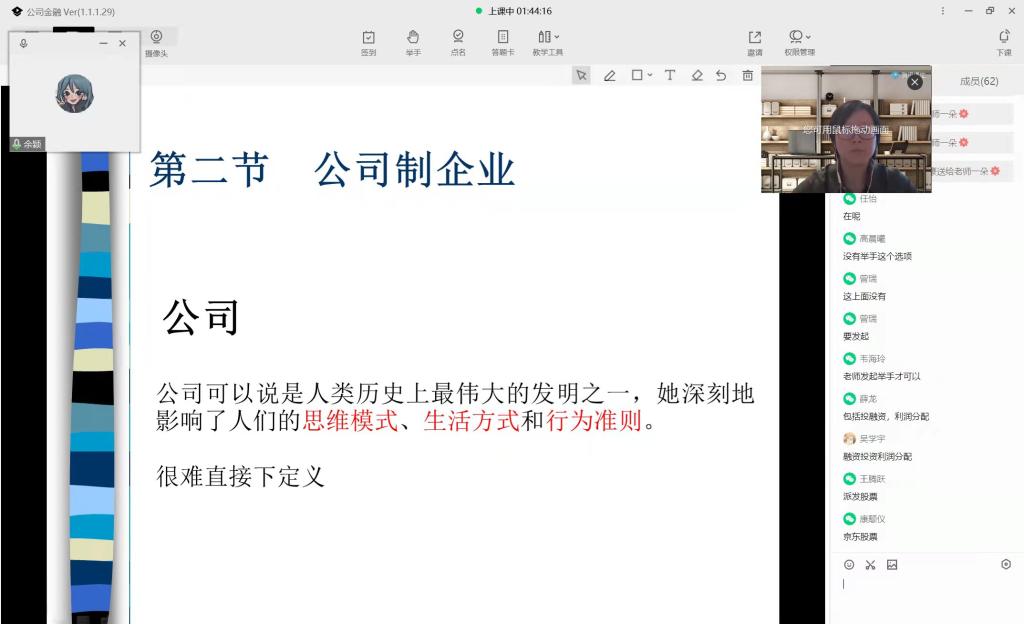 关娜老师给国际经济与贸易专业1901班的同学们讲授的《国际商务谈》,楚文静老师给金融工程1901班讲授的《公司金融》,授课教师通过签到、举手、点名、讨论等环节,丰富了线上课堂活动、明确了学生的参与主题,同学们自行形成学习小组,并且认真做笔记,课堂互动性很强,得到了同学们和督导组听课老师们的一致好评。