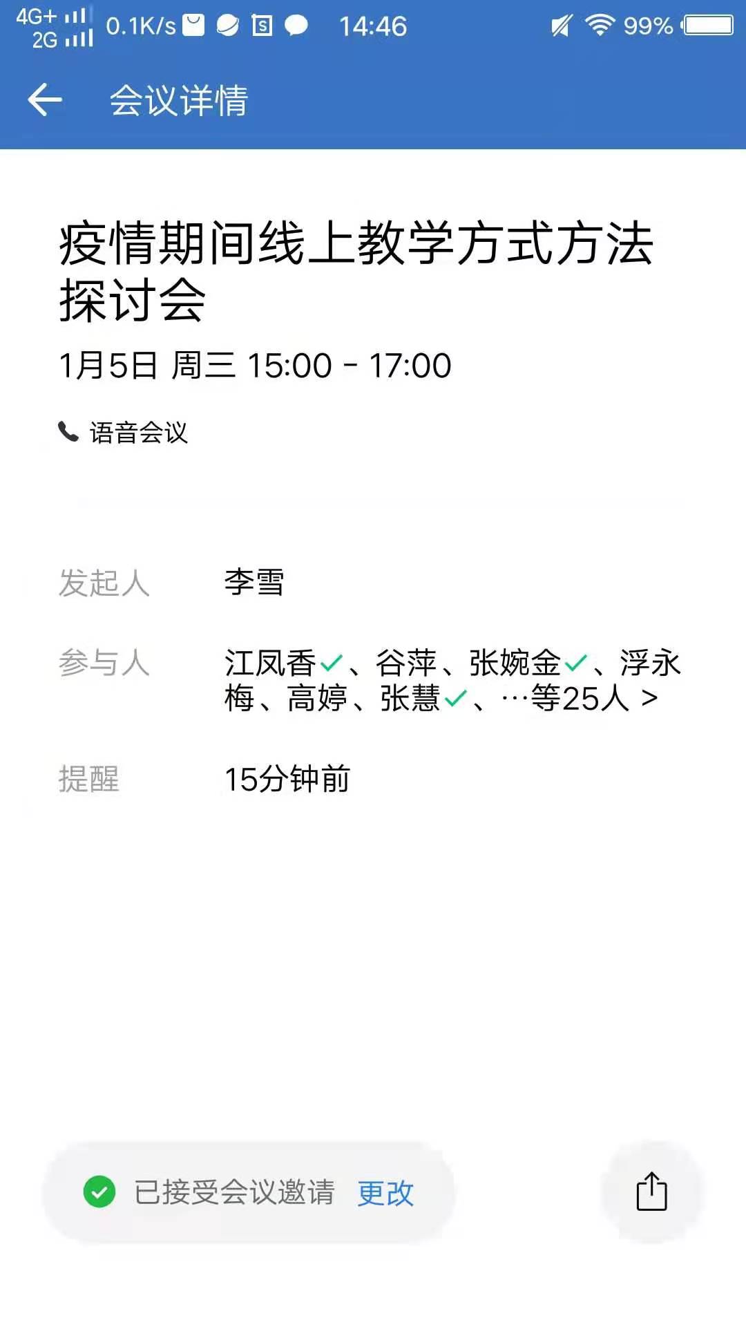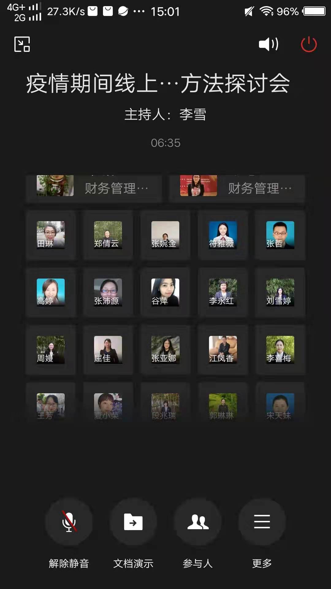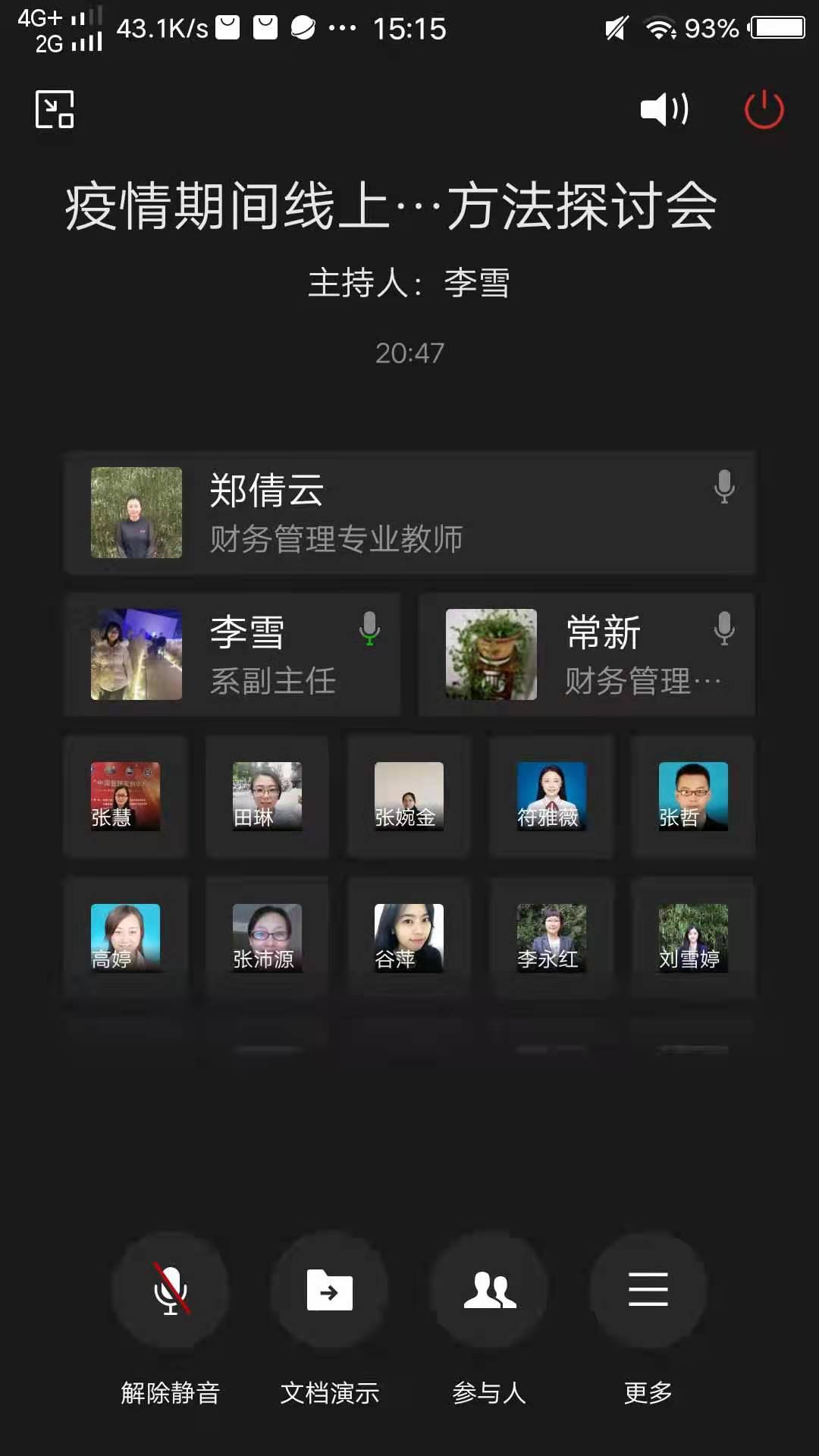 会议由李雪副主任主持,会议主要包括两个议题。首先,关于疫情期间,学生目前的学习现状,学习积极性、情绪等方面的分析,强调每位老师在上课期间也应关注学生目前的在校状态,心理影响因素。其次,关于开设线上课的教师们在上课方法、设备运行、考核考勤方面的交流,以及存在的问题。管理系共10位老师开展线上教学,涉及的课程包括《管理学原理》、《中级财务管理》、《财务管理》、《财务管理案例分析》、《绩效管理》等课程。