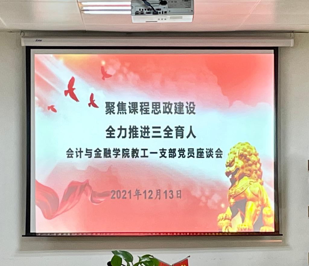 2021年12月13日14:30我院教工第一党支部在博远楼2115会议室召开“聚焦课程思政建设、全力推进三全育人”——教工一支部党员座谈会。参加座谈会的有会计与金融学院党委书记史立军、副书记韩斌、以及教工一支部全体党员教师。