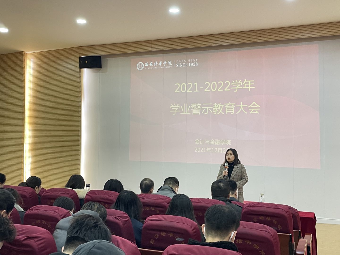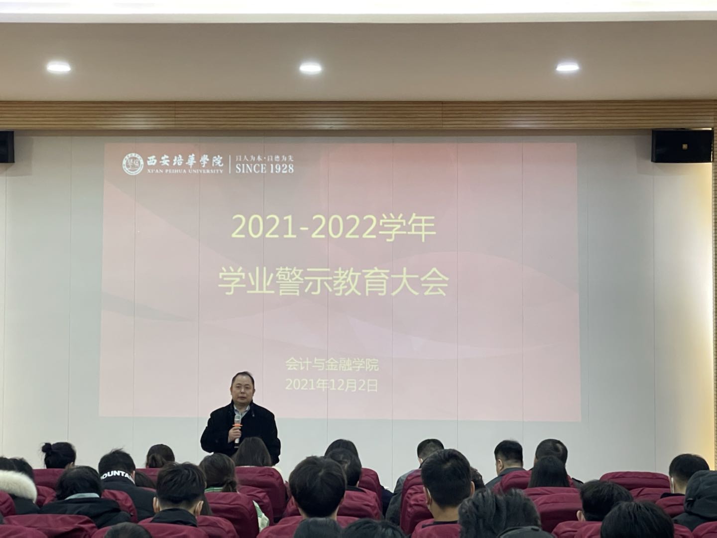 12月2日,为了进一步加强学风建设和学生学业管理,推动形成学校教育和家庭教育合力,警示、督促和帮助学业存在问题的学生及时转变学习态度,改善学习方法,不断提升自身学习效率和学习质量,会计与金融学院召开2021-2022年度学业警示教育大会。本次参会人员有,杨仕鹏副院长,史立军副院长,韩斌副书记,各专业负责人;辅导员以及学业导师;学生干事;红色、橙色预警等级学生。