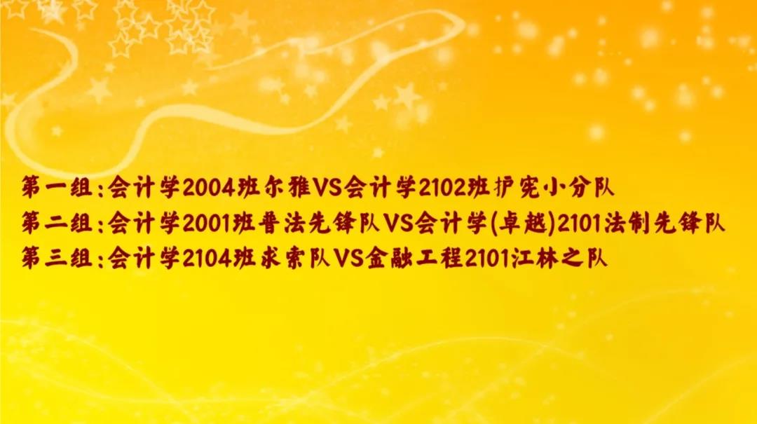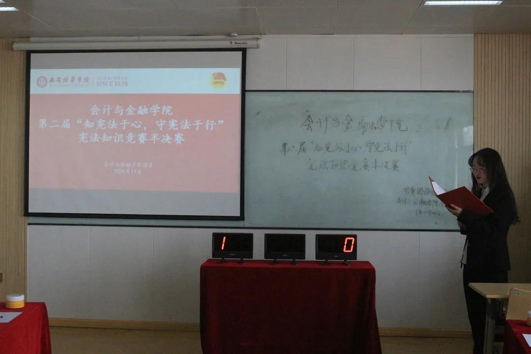 为贯彻落实习近平总书记系列重要讲话精神,增强我院团员青年法治观念,建设法治校园,我院团委于2021年11月26日在博远楼2614教室正式对初赛成功晋级的队伍进行会计与金融学院第二届“知宪法于心,守宪法于行”宪法知识半决赛。