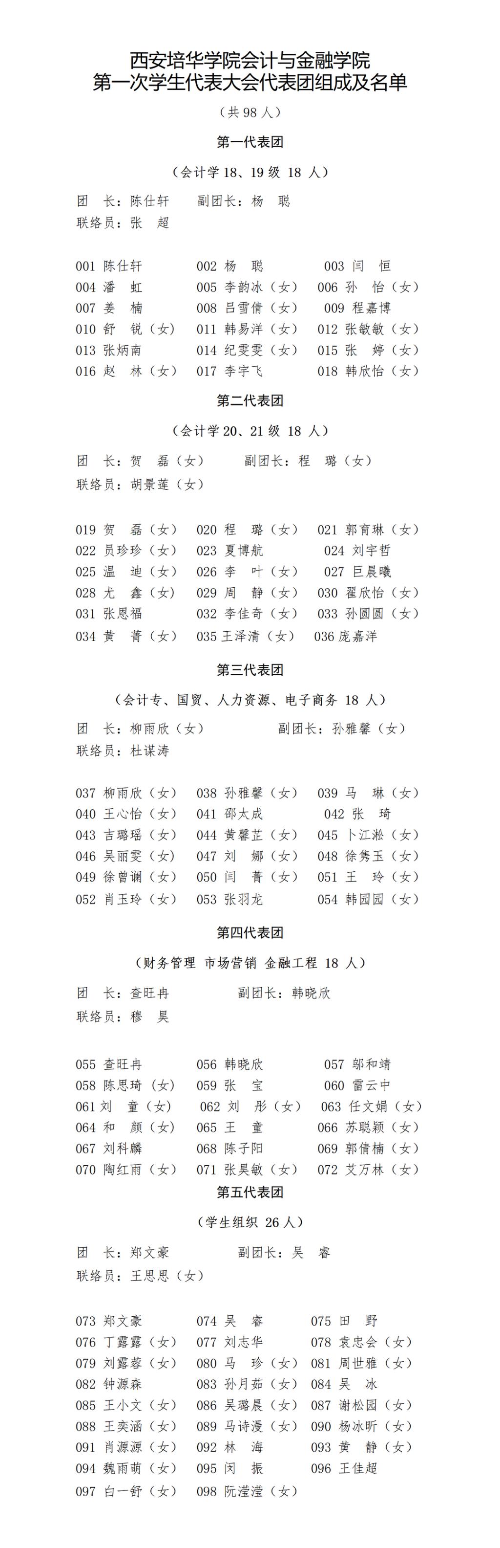 经会计与金融学院各专业班级、团学组织和学生社团的民主选举与推荐,并充分听取各辅导员意见,由会计与金融学院第一次学生代表大会筹备委员会综合筛选,拟推荐98人为会计与金融学院第一次学生代表大会学生代表,现予名单公示(顺序不分先后):