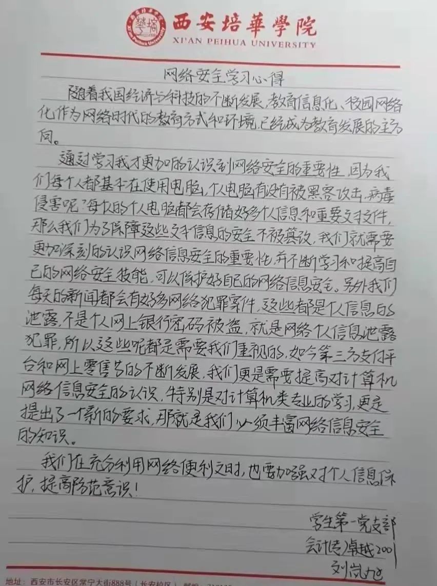 大家共同探讨分析了网络的利与弊、沉溺网络游戏的危害、网络信息泄露警惕、网络电信诈骗、以及安全上网、文明上网的重要性。与此同时,学生第一支部学生观看完网络安全教育视频后,颇有感想并分享了个人学习心得。