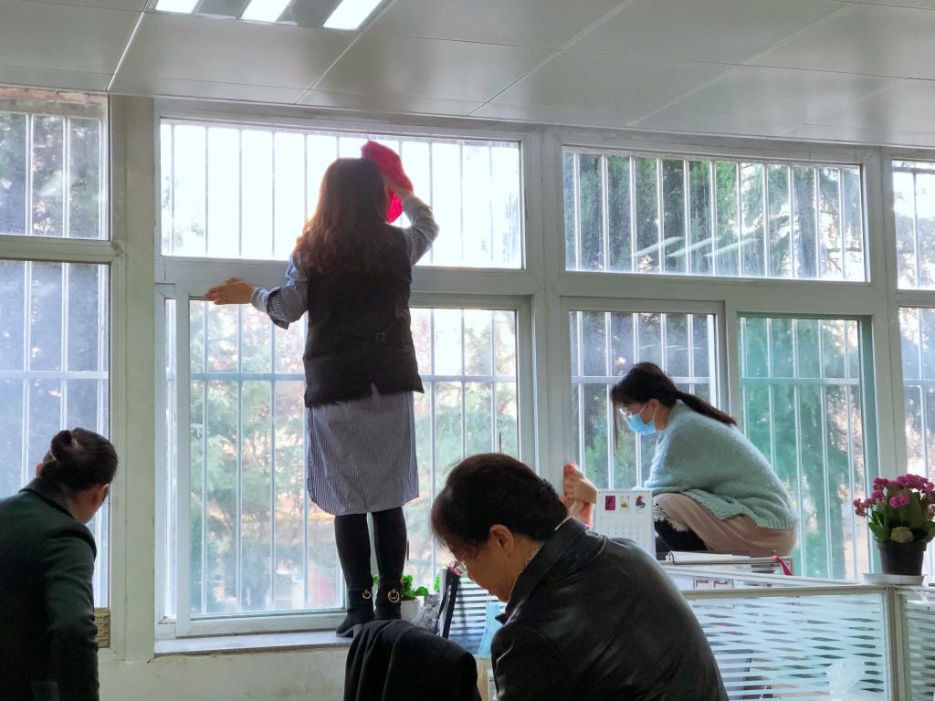 韩婷婷、刘雪婷、郭琳琳、李永红老师负责门窗玻璃、窗帘清洗;