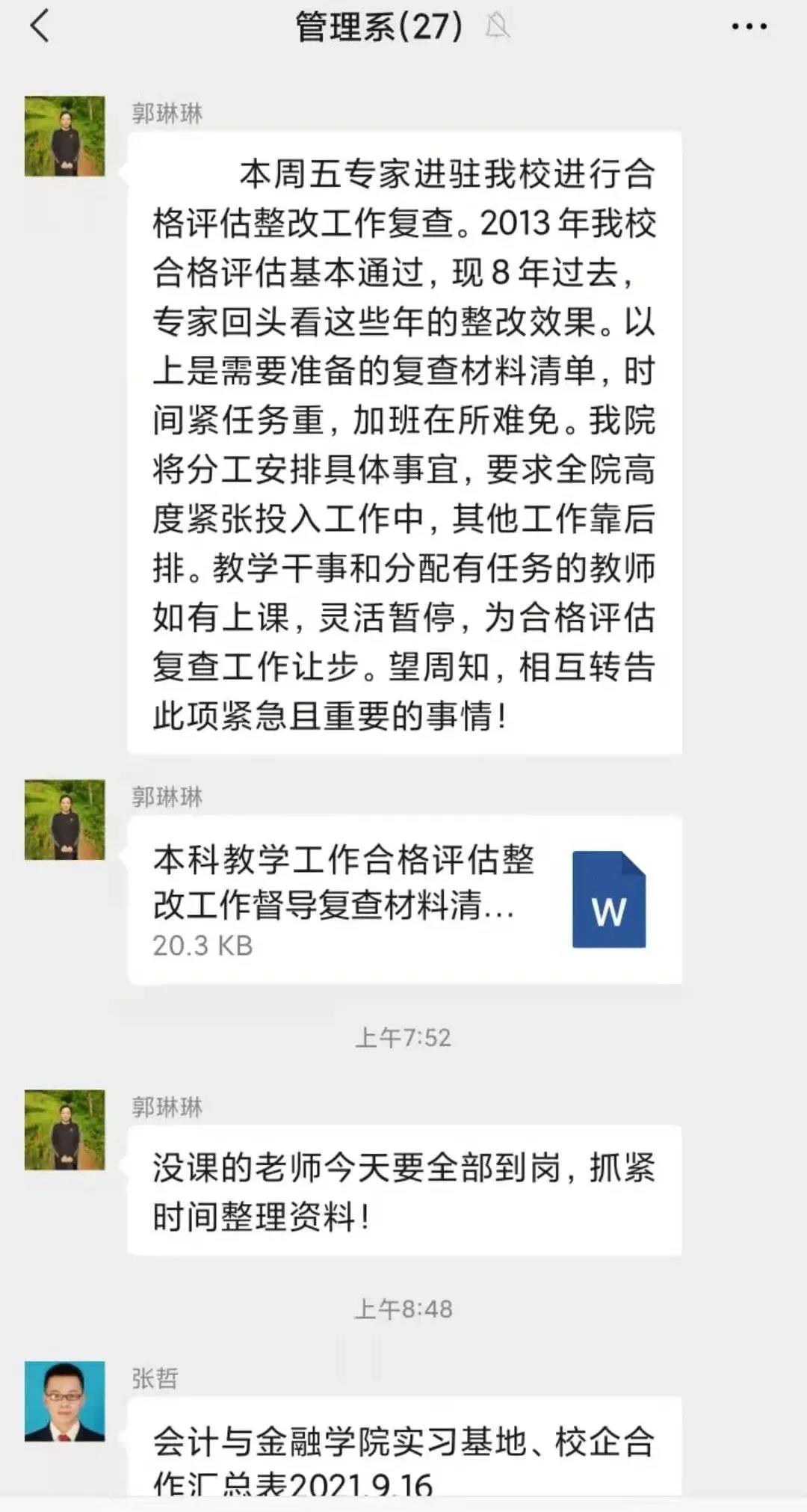 郭琳琳主任于2021年10月20日早7:45在企业微信上对管理系做了迎评工作方案部署:由张亚娜老师为总负责人汇总安排论文整改工作;由符雅薇老师为试卷整改总负责人展开期末试卷复查工作;其余未有授课任务的课老师及完成授课任务的老师积极响应配合按时按质完成审核评估前期工作任务。