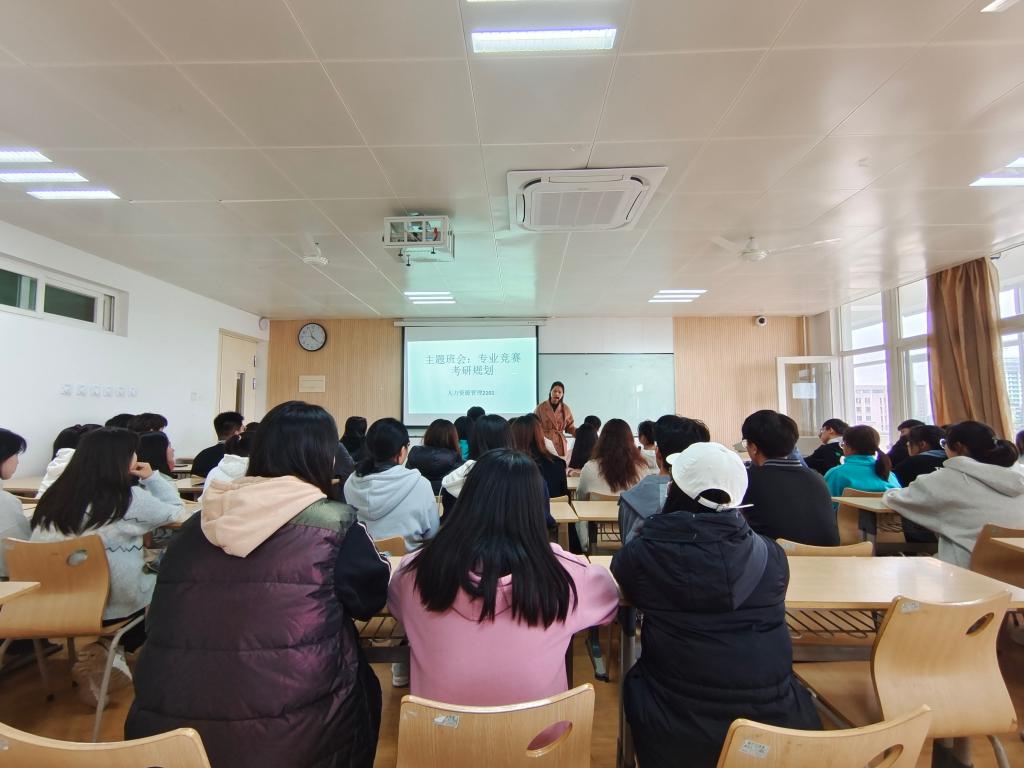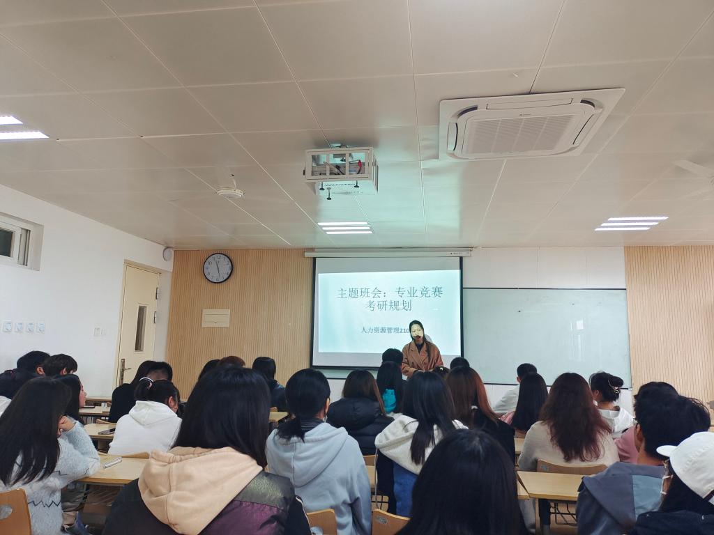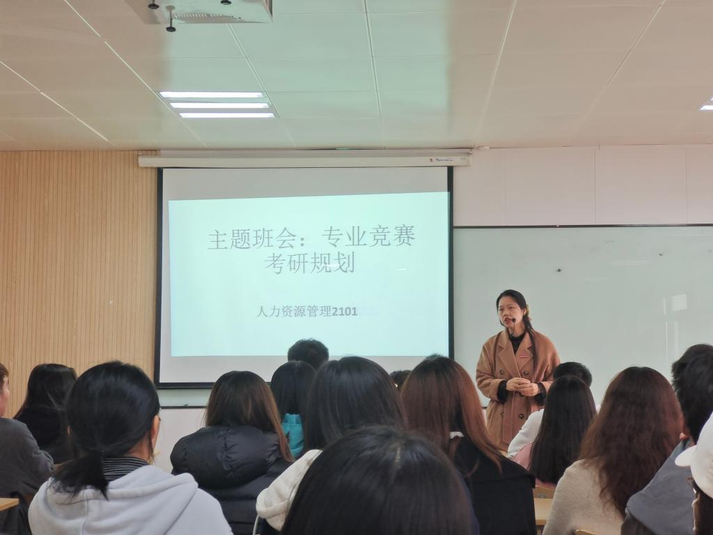 2021年10月12日上午11时,博远楼2518教室内,人力资源管理专业教师江凤香正在给人力资源管理专业2021级本科学生召开主题班会。