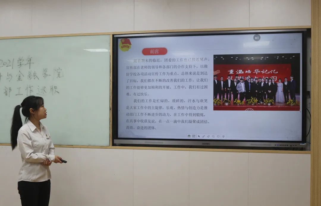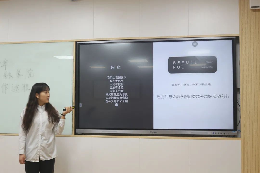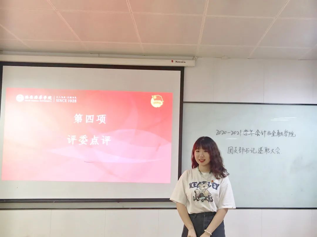 奋斗少年未来可期2021年6月16日16:00,会计与金融学院团委述职大会在博远楼2201如约而至,时光荏苒,我们又在团委度过了一个学期,欢笑与喜悦留在我们的心底。回首睨视,在团委的日子里,在学长学姐及老师的带领下,我们从一个个在面试中局促不安的小朋友成长为能够独当一面的大人,多了些许成熟和稳重。莅临本次会议的嘉宾有会计与金融学院团委书记唐璠、团委学生副书记全紫薇、组织委员王童、科技实践委员肖晨睿、纪律委员王玥涵、宣传委员郝欣茹、心理委员范力及各部门负责人。
