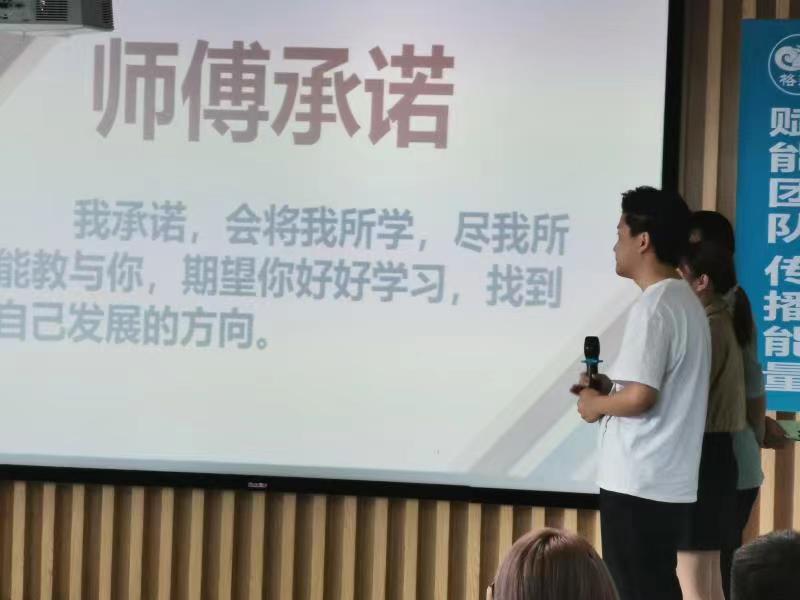 校企合作授牌仪式后,目前在公司实习的47名同学举行了庄严的拜师仪式;西安格迪公司为我院学生设置了企业导师,根据导师的个人业务水平和能力,将47位同学分成六个小组进行实习锻炼。企业导师宣读了师傅承诺,同学们分小组上台,向师父呈拜师帖、鞠躬行拜师礼,为师父奉上拜师礼物,表达对师父无限的真诚和感恩之意。