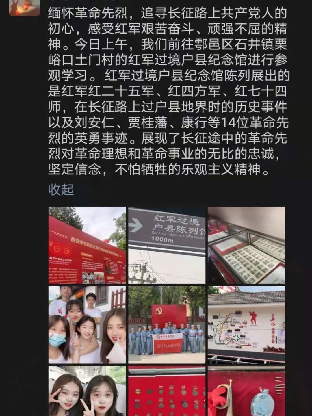 通过重温党的历史,感悟红色精神,我们更清楚的了解了历史上先辈们的不易,更近距离触摸与感悟到,党所领导人民创立社会主义伟大事业传承的必要。在此次学习教育中我们满怀激情的重温了入党誓词,并将此次追寻红色足迹的心得体会发表在各自朋友圈。