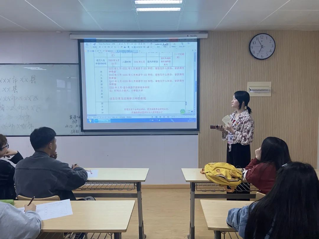 我院党委、团委工作人员对参会积极分子的填表注意事项进行讲解,给积极分子们示范表格的规范填写。在填表过程中遇到问题的同学们也能积极向工作人员提出疑问,工作人员对此也作出了详细的解答。