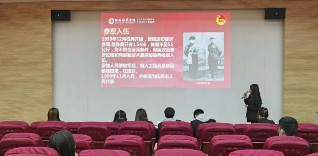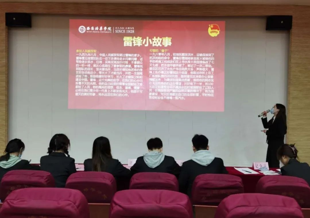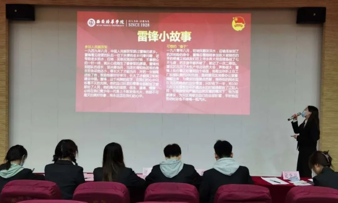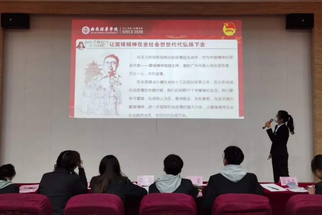 团支书讲解内容紧紧围绕主题,立场鲜明、观点正确、充分体现理论与实践的结合,语言规范、熟练运用幻灯片,课程内容重点突出,主次分明,紧抓活动主题,以展板、海报等各类媒体宣传交流,并充分利用新媒体在支部内开展教育活动,带领支部成员学习党的历史,弘扬雷锋精神。