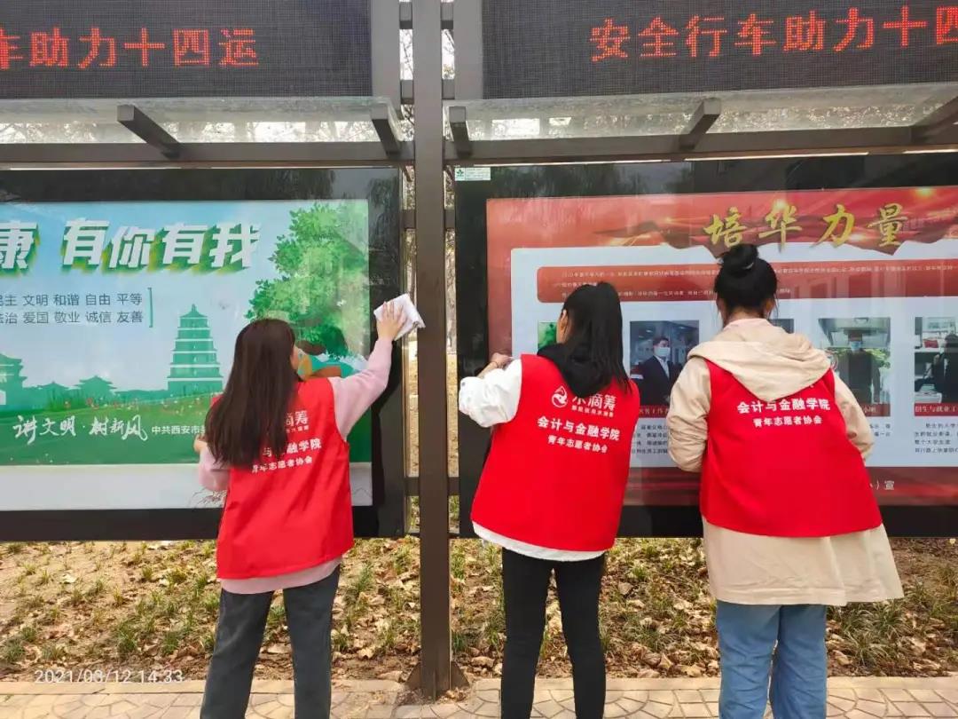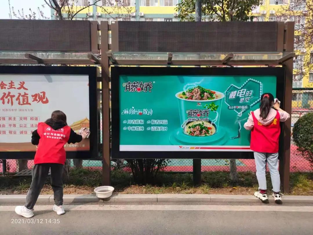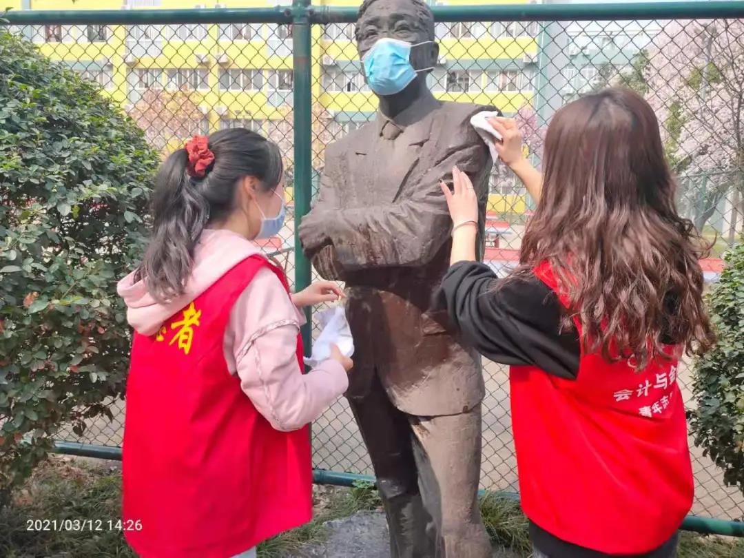 新生的太阳新生的希望,志愿者们热情洋溢的擦拭着雕像与报栏,就连细微之处的污垢也不放过,一丝不苟的对待着自己的工作。认真——是志愿者们的态度。