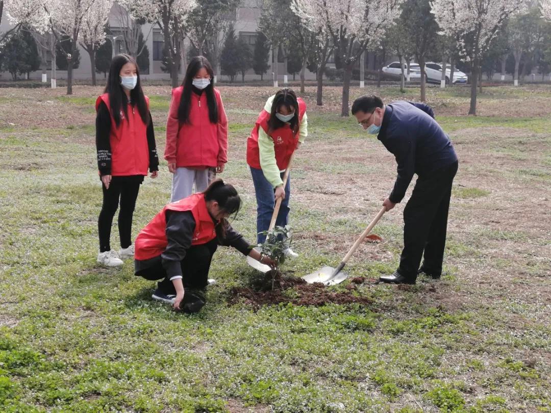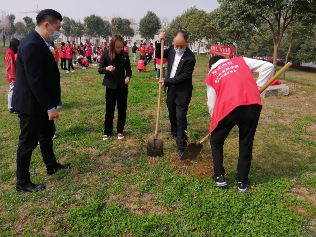 在阳光的照耀下,植树活动热烈展开。志愿者们与老师们分成几组,相继参与到植树工作中,或用铁锹铲土,或帮助固定小树。志愿者们在小树的周围覆起一个环形土堆,再在坑中浇上净水。随着最后一寸土壤被压实,在所有参与者的共同努力下,小树扎根草地,增添片片新绿,萌生点点春意。