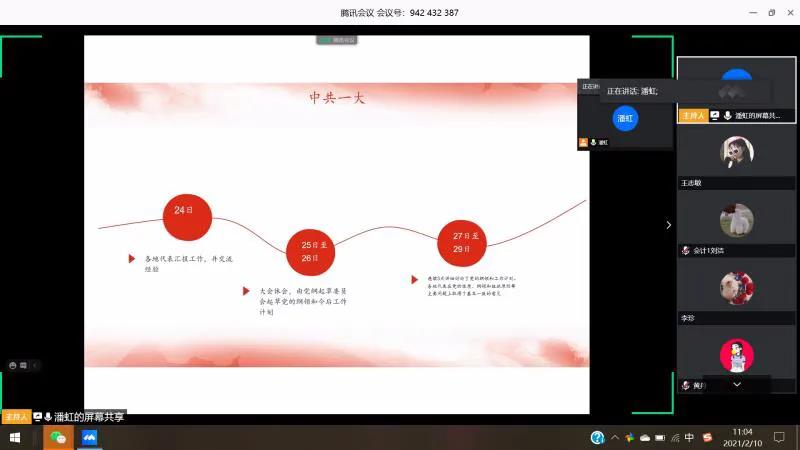 百年潮 正青春2020/跟/我/一/起/读/党/史/2021年是中国共产党成立100周年。中国共产党的成立,是开天辟地的大事变,深刻改变了近代以后中华民族发展的方向和进程,深刻改变了中国人民和中华民族的前途和命运,深刻改变了世界发展的趋势和格局。为庆祝中国共产党建党100周年,进一步坚定党员同志在中国共产党领导下走中国特色社会主义的信念,加强“四史”学习教育,重温百年党史,会计与金融学院党委开展了“百年潮,正青春”系列活动之“跟我一起读党史”。本次活动由各党支部自主选题,可围绕中国共产党成立100周年以来的重要事件、历史物件、红色足迹、党员心声等四方面开展读党史活动,深入学习一百年来党的光辉历程和宝贵经验。2021年2月10日会计与金融学院学生第一党支部潘虹同学以“中共一大”为主线展开了他的“党史阅读”。