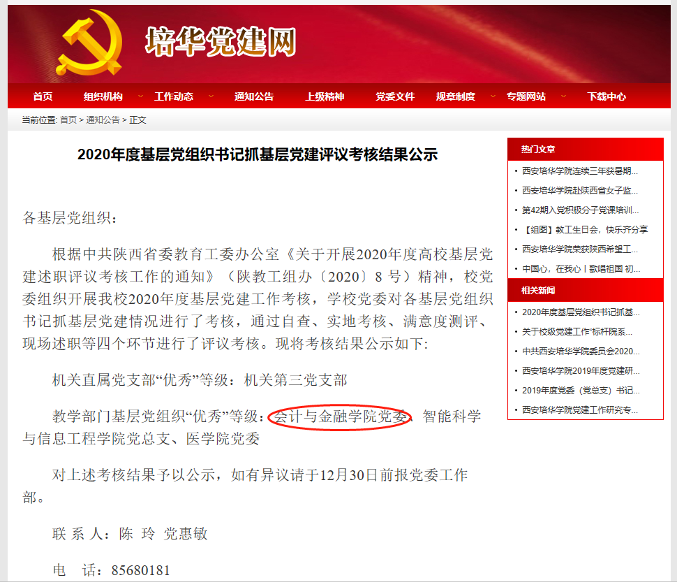 近日校党委根据中共陕西省委教育工委办公室《关于开展2020年度高校基层党建述职评议考核工作的通知》(陕 教工组办[2020] 8号)精神,组织开展我校2020年度基层党建工作考核,通过自查、实地考核、满意度测评、现场述职等四个环节的考核,会计与金融学院党委获校级基层党组织书记抓基层党建“优秀”等级荣誉。