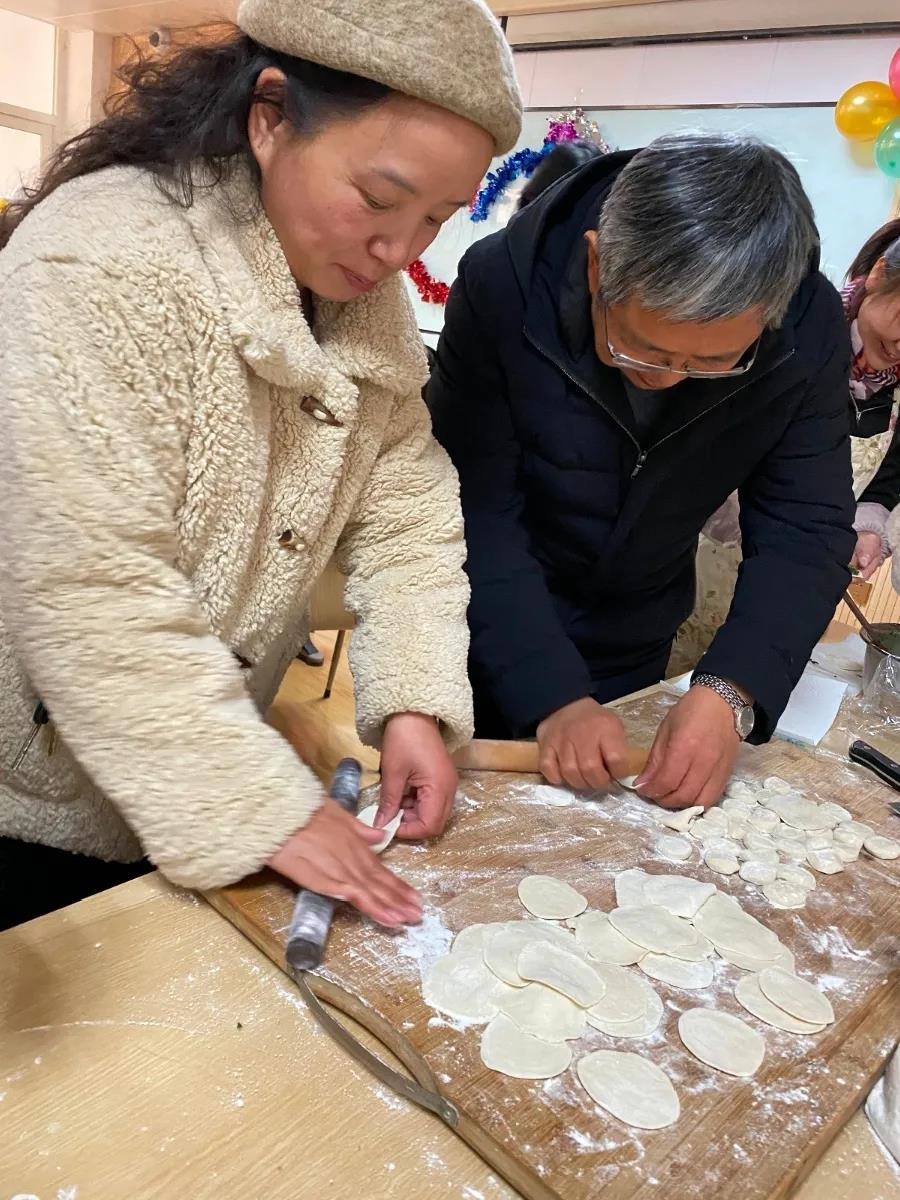 领导、老师围坐一桌忙碌起来,擀皮、放馅、捏褶、包边,动作娴熟的包好一只只圆鼓鼓的饺子,大家相互切磋包饺子的技巧,聊学生、话家常,欢声不断,场面热闹而温馨。
