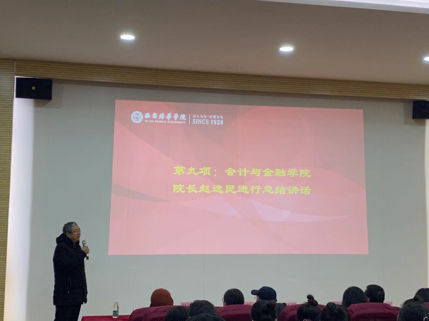 大会第八项,由会计与金融学院赵选民院长做总结讲话,赵院长感谢两位企业家对我院师生的信任,同时感谢企业给予我院学生的宝贵实习机会,对同学们的实习汇报和应聘经验分享给予了高度评价,这段实习经历必将帮助学生增强就业信心,端正就业观念,走向新的征程。