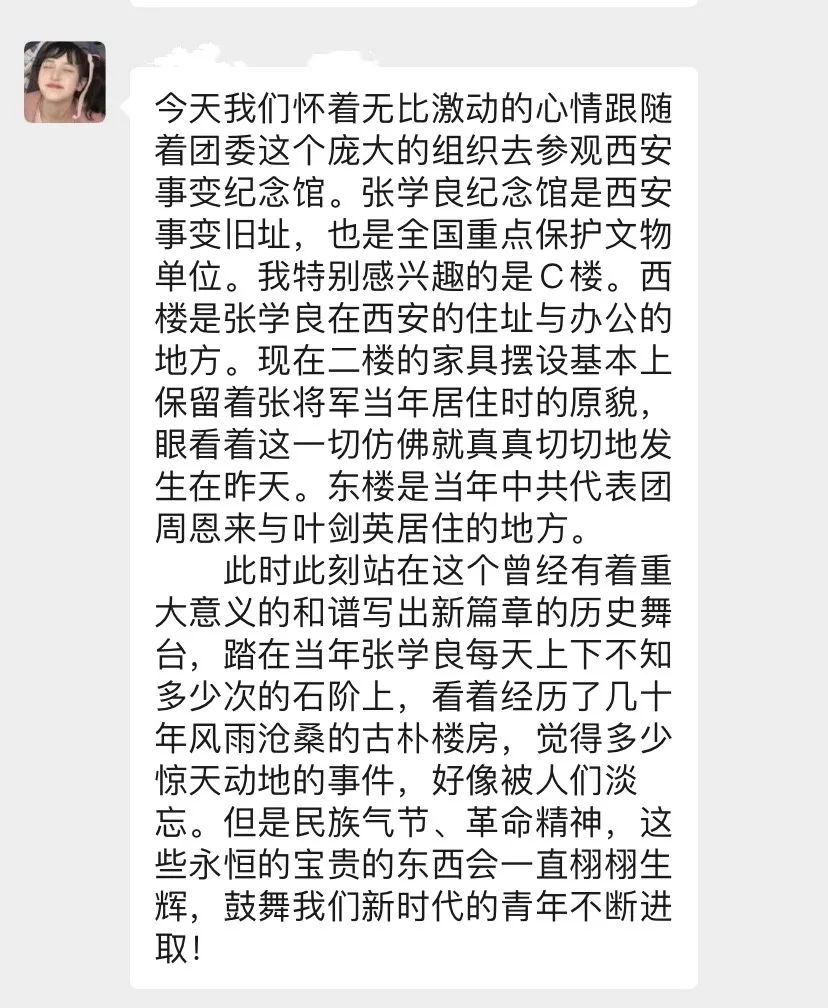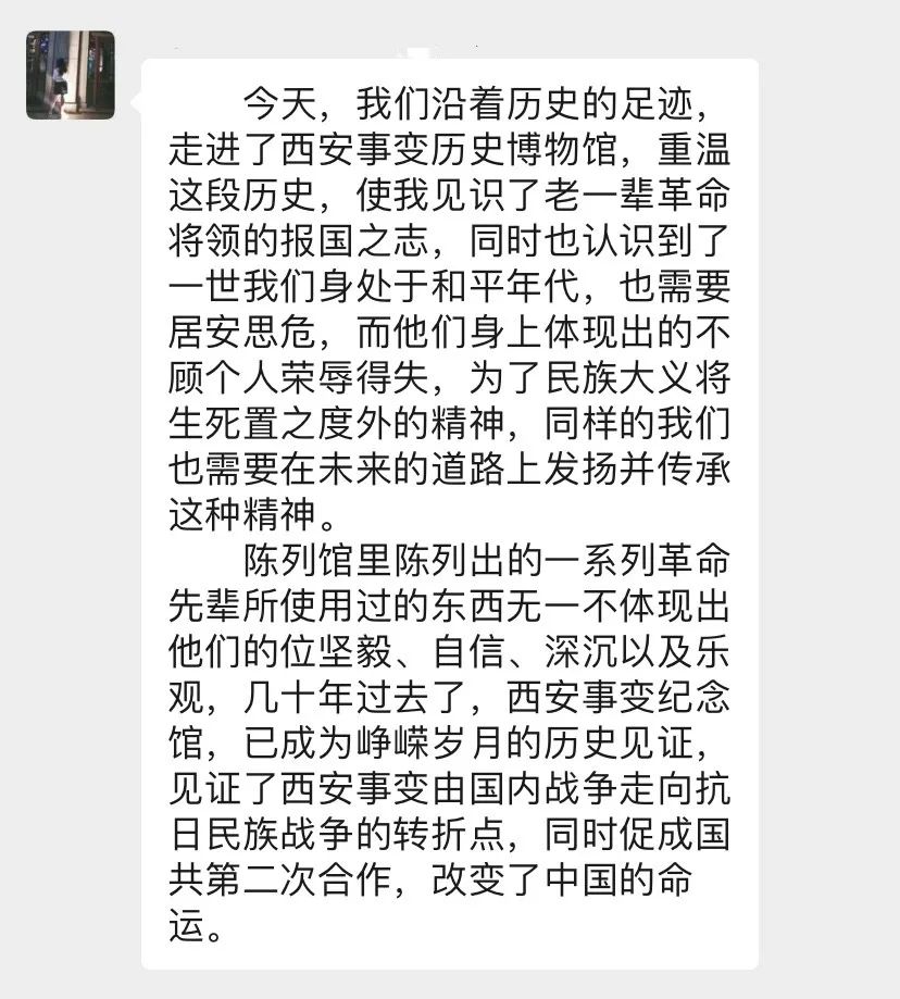 在纪念馆讲解员的讲解下,我们了解到西安事变旧址作为西安事变这一历史事件发生的特定空间,它见证了事变从酝酿、爆发到和平解决的全部过程,感受了事变对中国历史的影响,也感受了老一辈革命家敢于斗争、共赴国难的历史使命和报国之志。