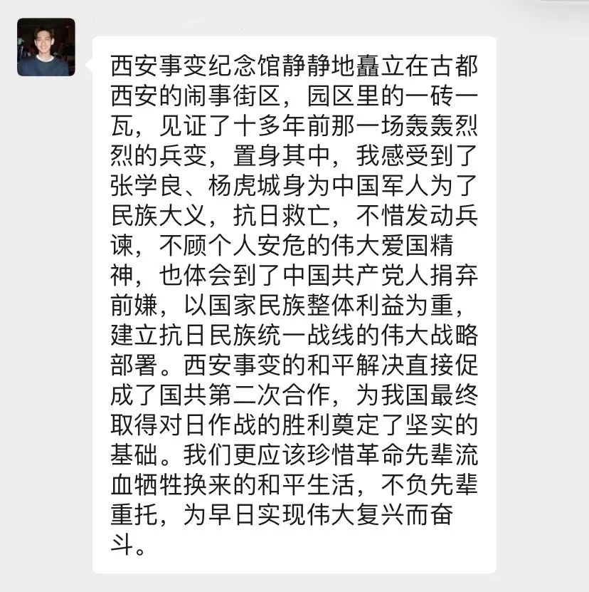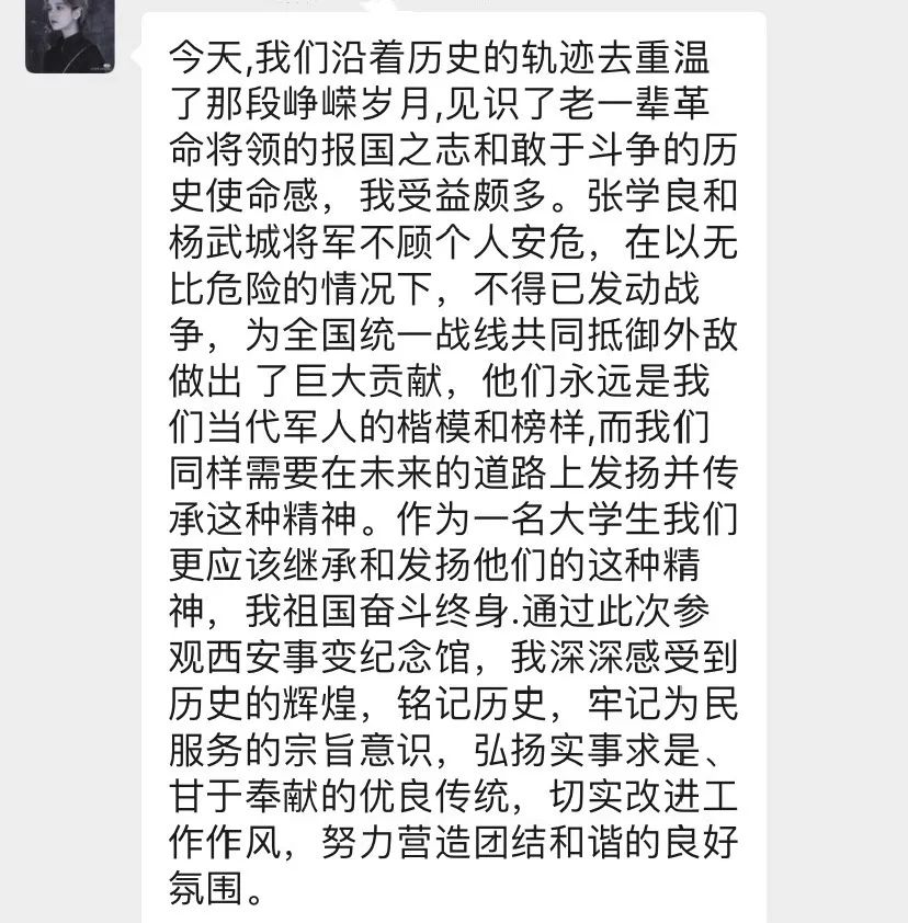 张学良、杨虎城两位将军不顾个人荣辱得失,为了民族大义,将自己生死置之度外的精神令我们动容。大家纷纷表示,一定会传承发扬革命精神,以革命先烈为榜样,培养自己坚韧的品格,不计较个人得失,积极工作,发挥模范带头作用。