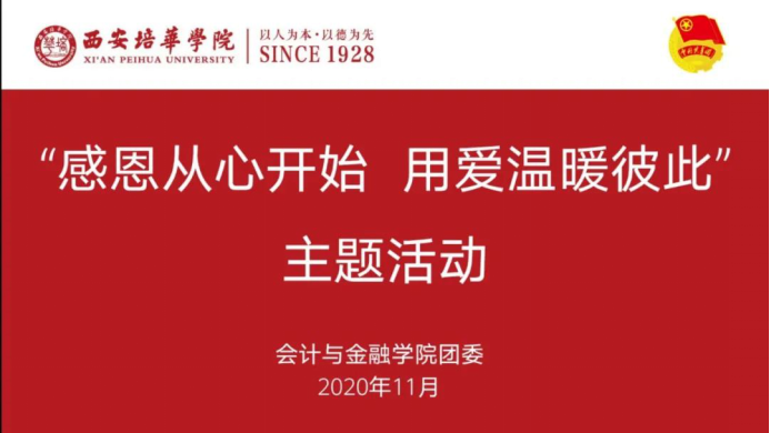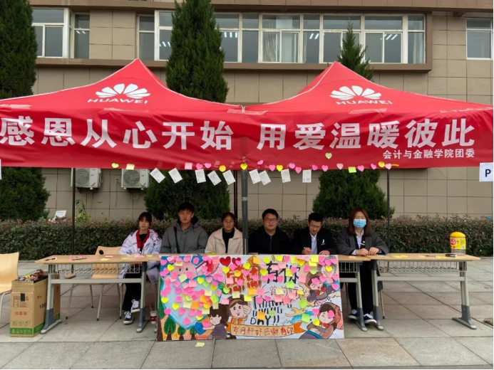 会计与金融学院团委于11月26日开展了以“感恩从心开始,用爱温暖彼此”为主题的活动。不仅用手势舞和朗诵等活动来表达我们的感恩之情,更有“感恩墙”、给培华校园内默默付出的工作人员准备手工艺品等活动丰富师生的精神文化生活,也对那些冲在前线的医务工作者予以感恩之心。