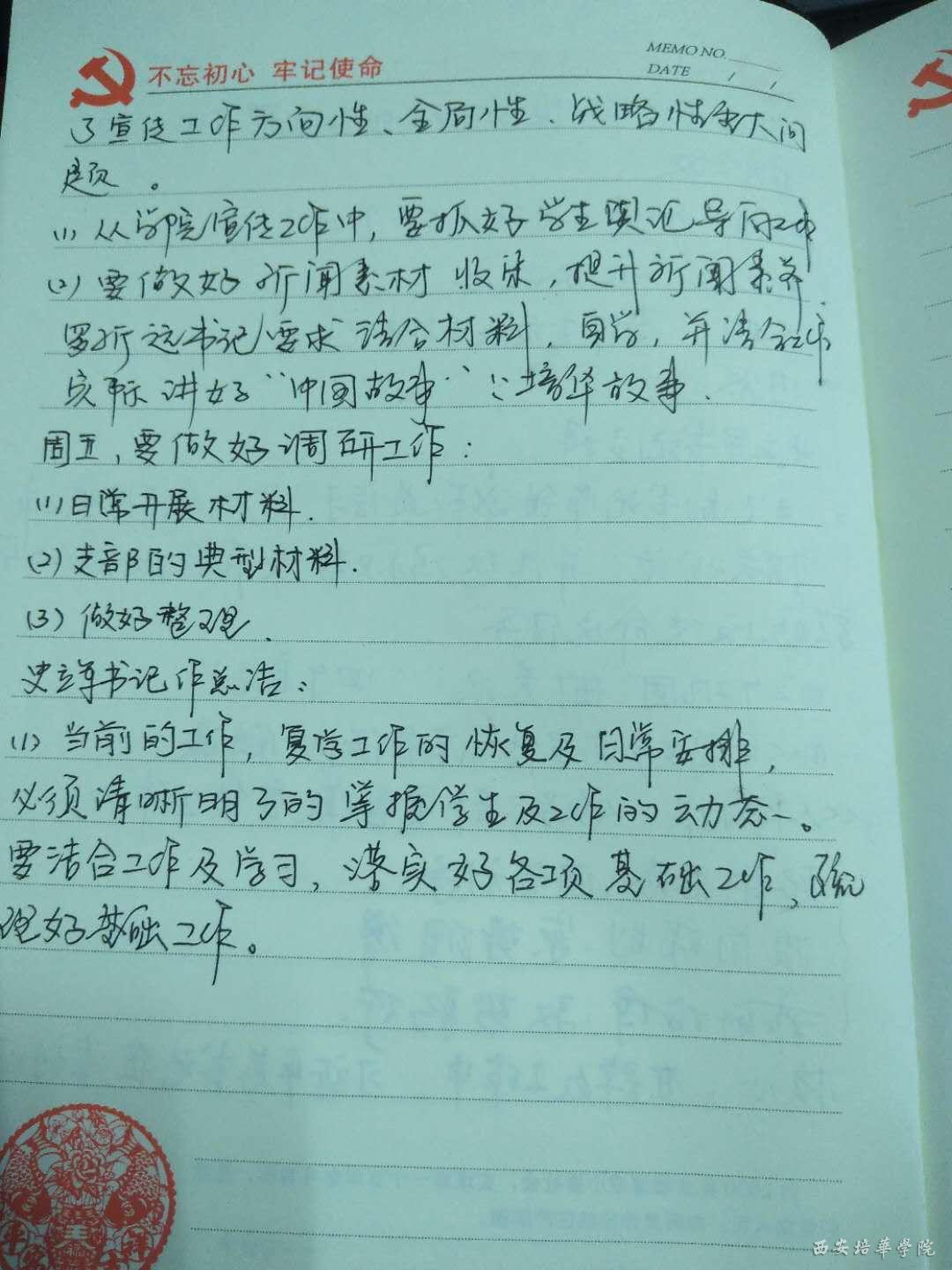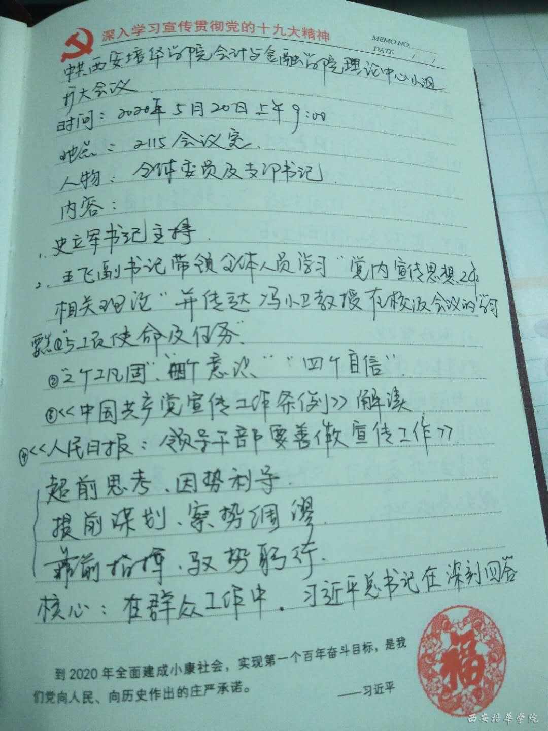 院党委副书记王飞不仅仅带领全体成员重温了习近平总书记重要讲话,并且传达了冯小卫教授在校级会议的学习要点:1.“5项使命及任务”;2.“2个巩固”“四个意识”“四个自信”;3.《条例》的全面解读;4.《人民日报:领导干部要善做宣传工作》,做到超前思考,因势利导,把握好其核心内容,对于宣传工作方向性、全局性、战略性要着重把握。他在最后谈到:我们应该从学院抓起,做好宣传工作,抓好舆论导向工作,做好日常生活工作的宣传工作,讲好属于中国人的“中国故事”,讲好属于培华人的“培华故事”。