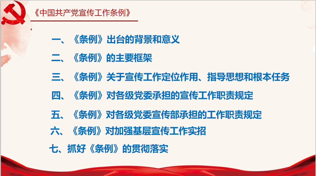 我们更要以中央宣传部为标准从以下方面抓好《条例》的贯彻落实:1.加强学习宣传。推动将《条例》纳入党委(党组)理论学习中心组学习内容,组织开展学习培训和宣传阐释,让党员干部准确把握《条例》精神和主要内容。2.完善配套制度。加强统筹谋划,推动各地区各有关部门进一步建立健全宣传领域法规制度,把《条例》各项规定落细落小、落到实处。3.做好督促落实。适时开展专题调研,深入了解《条例》贯彻落实情况,推动解决工作中的困难问题。