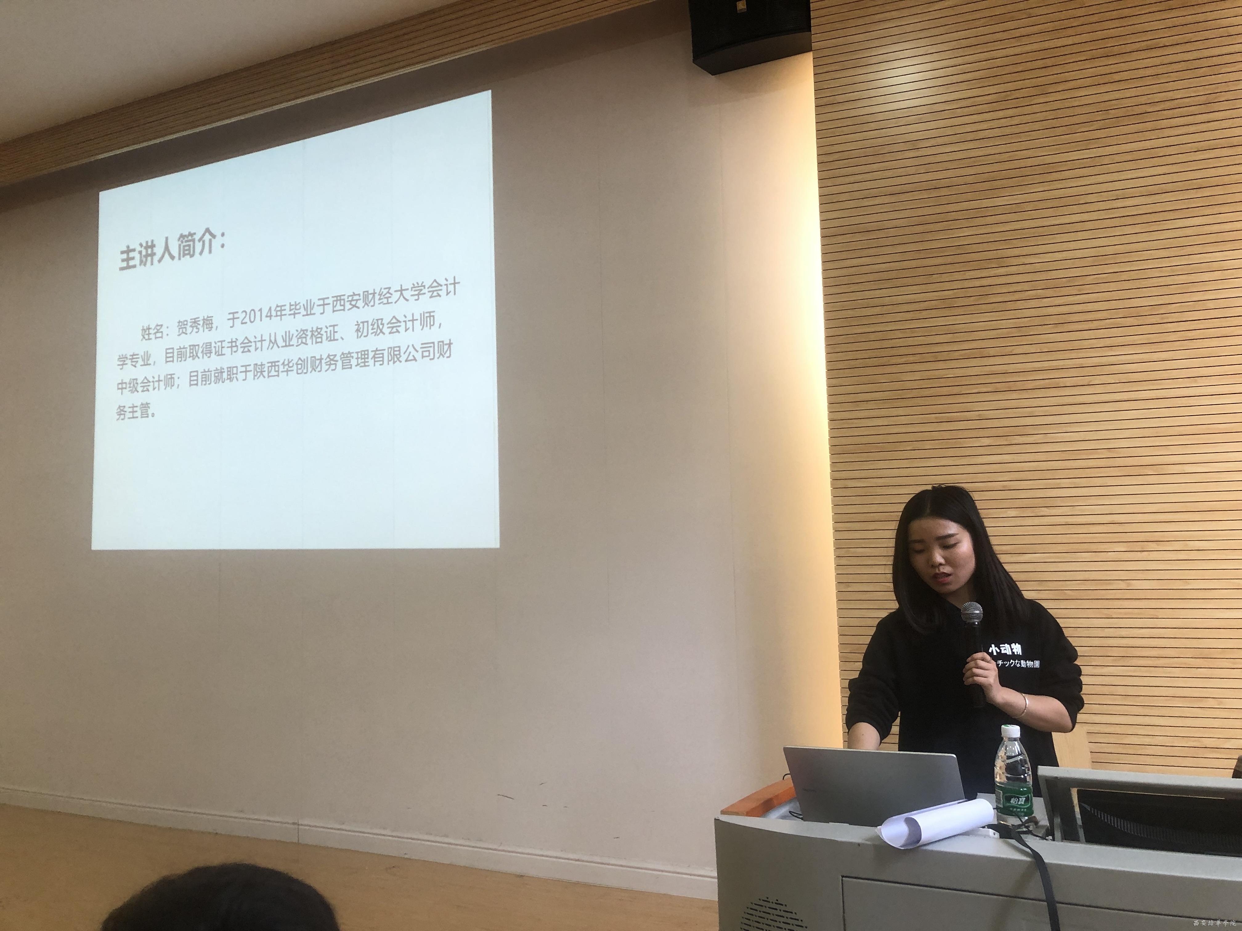 本次讲座旨在帮助我系学生了解真实的企业做账流程,尤其是纳税申报这个环节,让很多即将参加实习的大三学生直呼干货满满。讲座开始,首先由陕西华创财务管理有限公司创始人付攀向大家介绍了公司的发展历程,以及公司主要的代理记账业务,也给予到场的学生很多实习期以及进入职场的忠告和建议,因为他见过太多缺乏实践经验的会计学专业毕业生,他也号召大家尽量参与校内校外的各种专业实习,为以后就业打下基础,这些肺腑之言,引来同学的阵阵掌声。