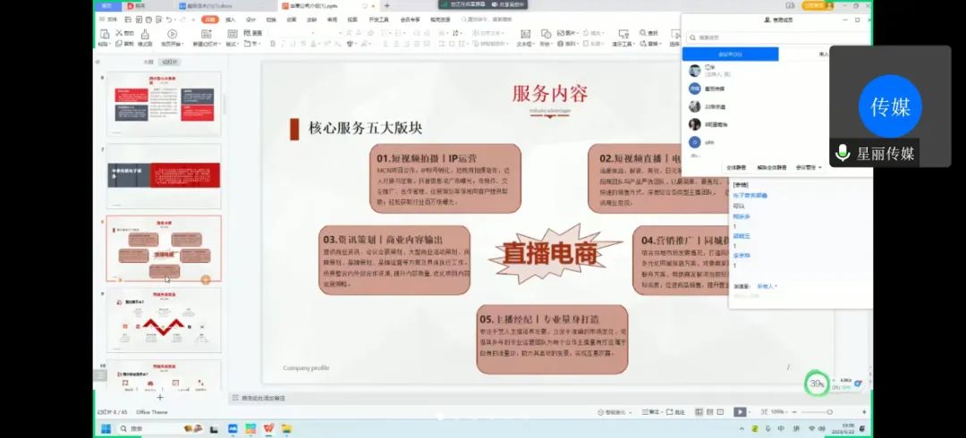 培训第一项介绍核心板块,内容分别为华果传媒电子商务、直播电商云仓基地、高校联盟、商学院四个主要部分,随后向大家讲解了核心服务的五大板块,即短视频拍摄;IP运营、短视频直播;电商运营、咨询策划;商业内容输出、营销推广;同城探店、主播经纪。