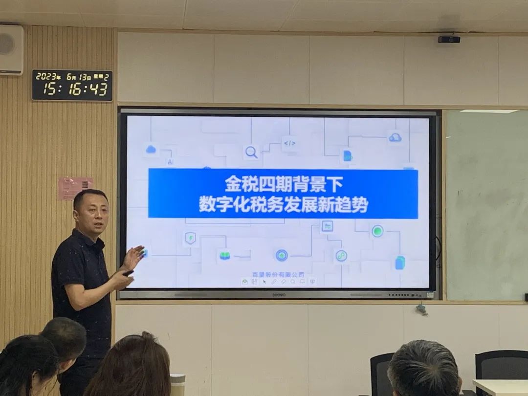 接下来,百望股份陕甘宁区域总监王涛做了主题为“金税四期背景下数字化税务发展新趋势”的报告。他介绍了金税四期的建设内容与带来的影响、发票电子化改革下“全电发票”和现有发票的区别以及数字化税务未来发展新趋势等内容,为教师们带来了来自业界的最新动态和现状。