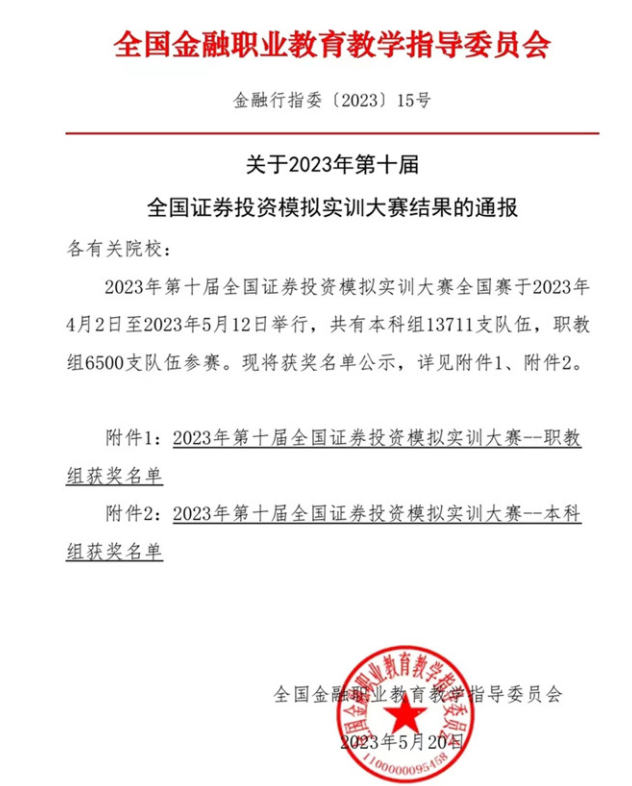 近日,由全国金融职业教育教学指导委员会组织的2023年第十届全国证券投资模拟实训大赛传来佳报。本次大赛共有本科组296所院校的13711支队伍参赛,职教组226所院校的6500支队伍参赛。大赛以线上投资模拟(股票、基金、债券)方式进行,各参赛队伍线上模拟投资,按照总账户收益率排名。