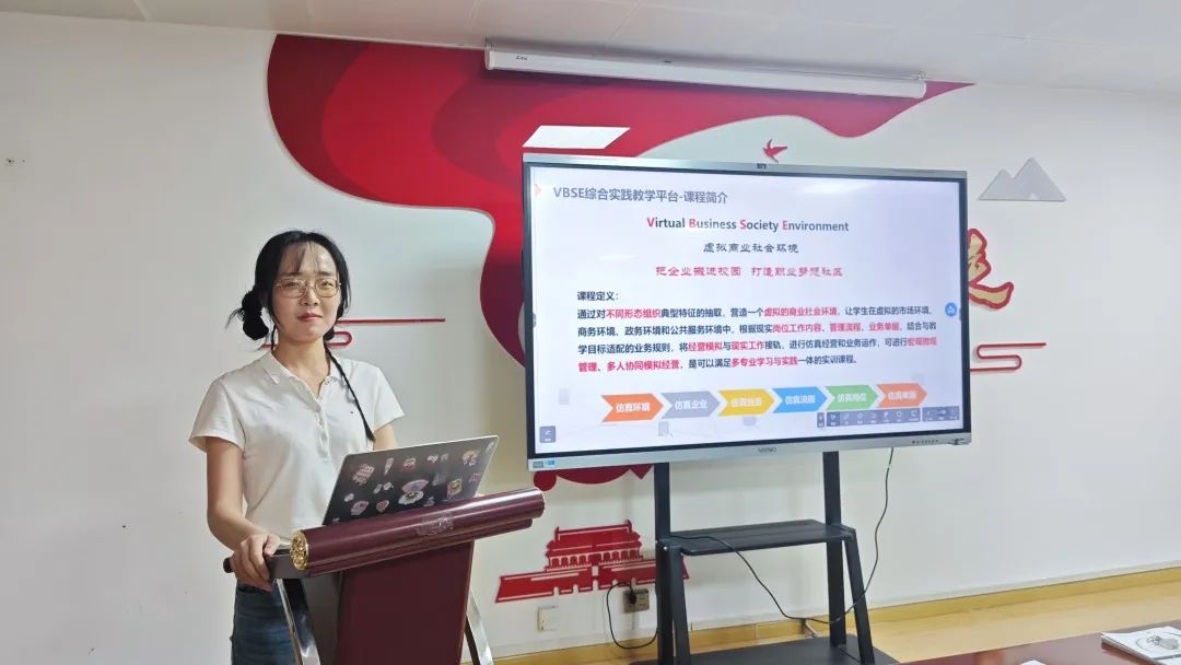 严琳老师讲授的是《VBSE综合实训》,严老师通过说课的方式进行试讲,为了打造应用型人才培养模式,通过以“理论知识”“职业素养”,与“动手技能”的有机进行结合,从现实岗位工作内容、管理流程、业务单据,将经营模拟与现实工作接轨,进行仿真经营和业务运作,结合适配教学目标的业务规则,培养高潜质、有全局观的实务型岗位管理人员,从而完善院校实训培养。严老师在授课过程中思路清晰,课件制作精美,能够从岗位出发,结合教学目标,进行教学设计,评委建议应按照要求选择具体一节内容进行讲解,同时在授课中要有较好的教姿教态,适当提高音量,提升教学效果。