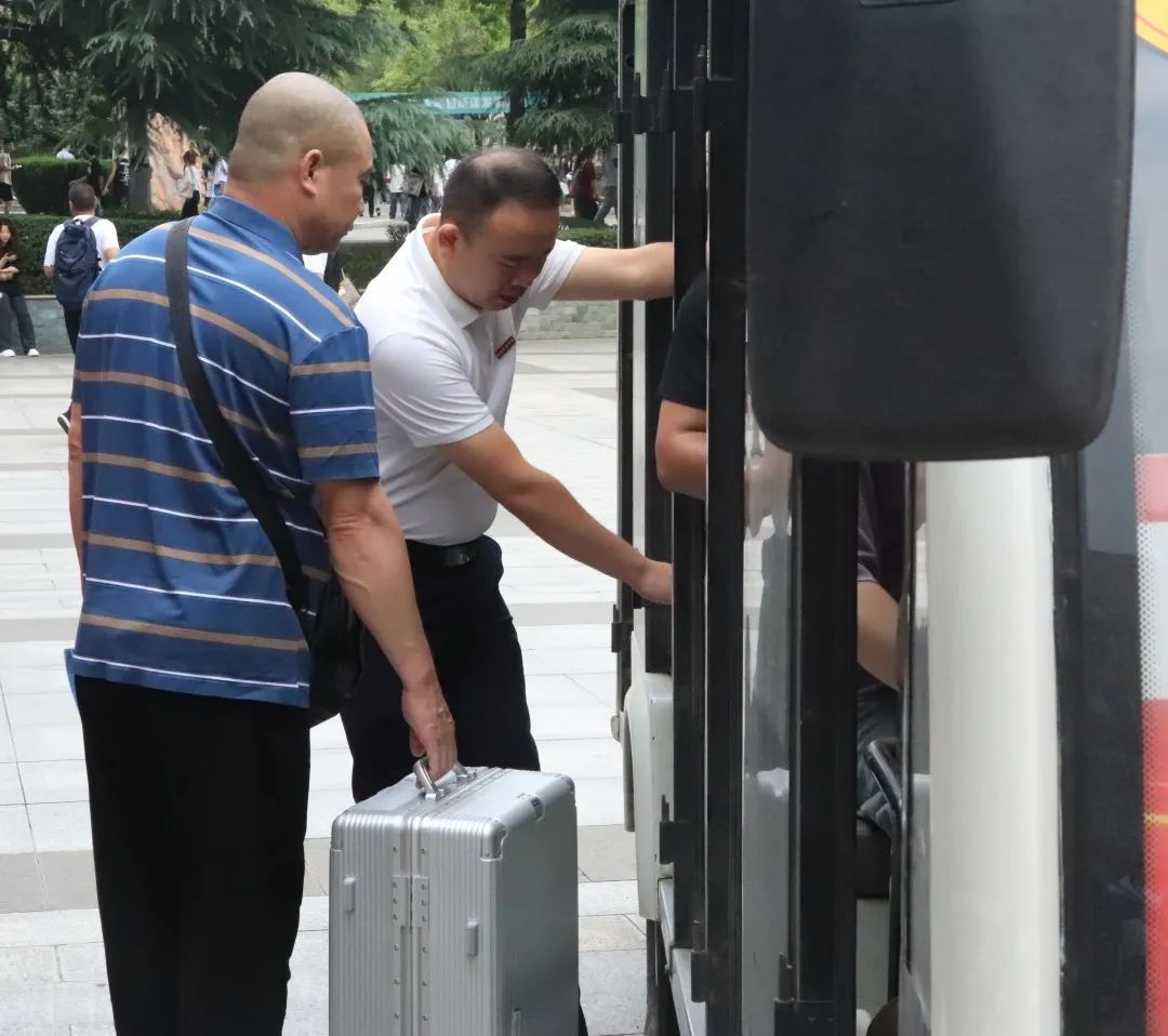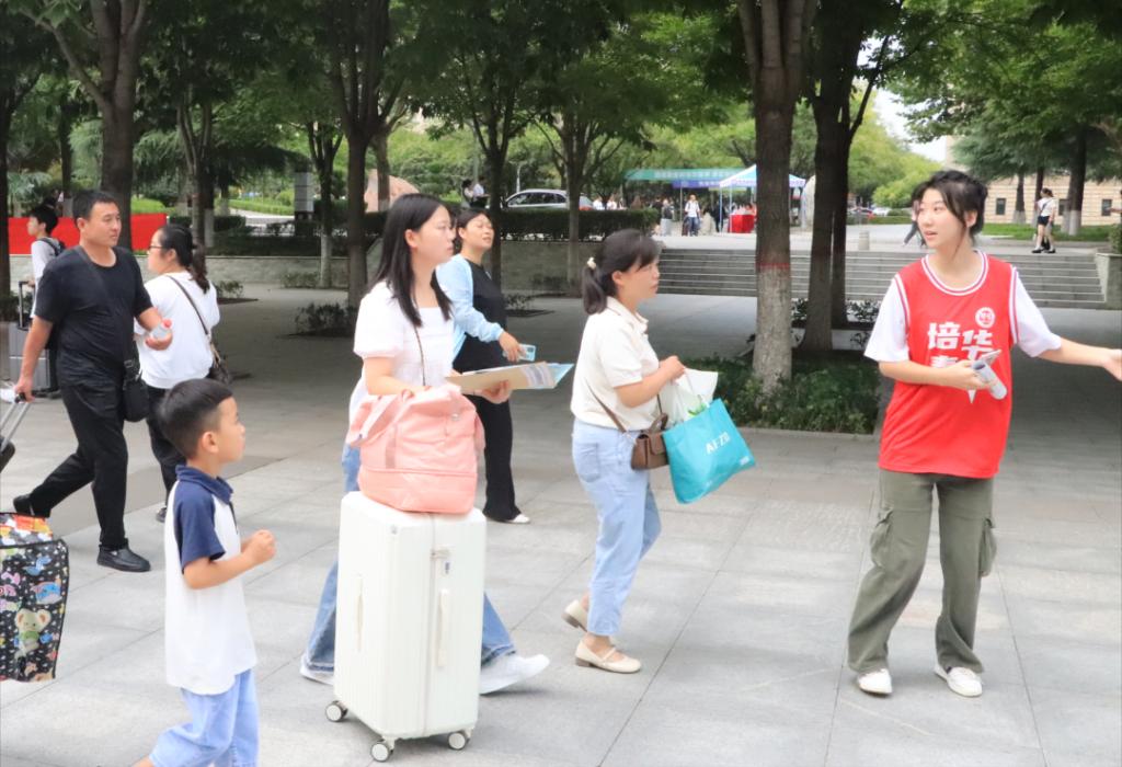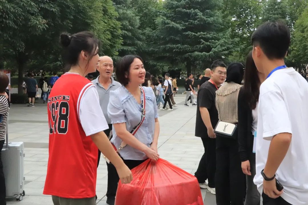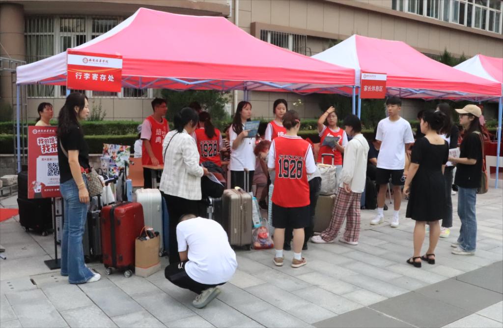 新生们的行李可以寄存在广场上,有学长学姐代为保管。在自己的行李上贴上温馨字条,字条上写上自己的名字,在完成报道事宜之后,取走自己行李。在校园的每个角落,都有志愿者们的身影。他们主动接过新生沉重的行李,用小推车摆渡车一件一件的帮同学们搬运行李。