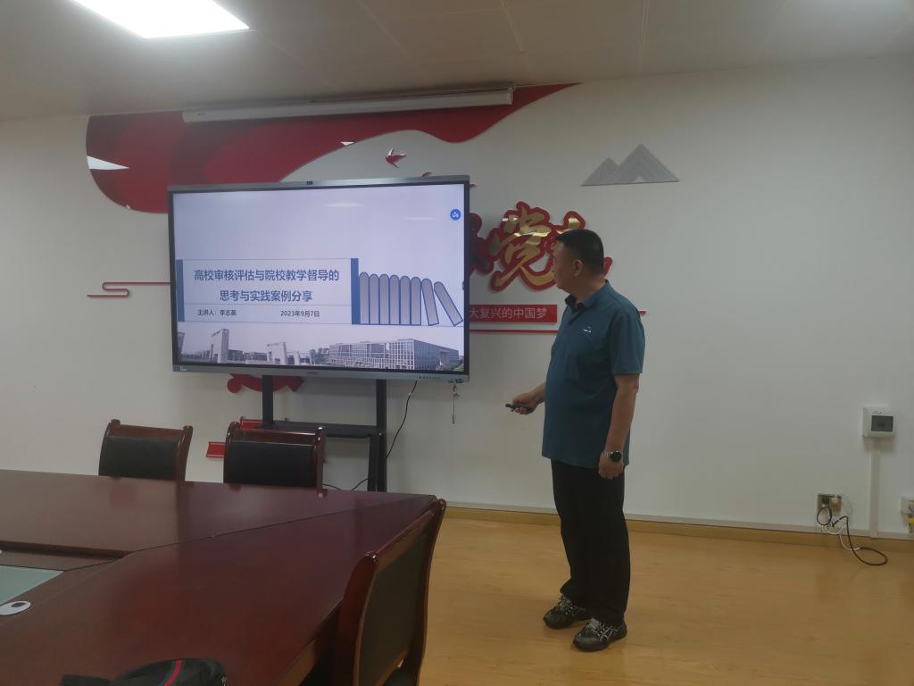 李老师在汇报中,首先从“高校审核评估与院校教学督导的思考与实践案例分享 ”主题出发,分享了新形势下教学督导任务和要求、教学督导队伍建设与职能拓展、常态化教学督导工作改革创新和院校评估与督导实践案例解析;然后从“审核评估背景下高校内部质量保障体系构建与评价”角度分析高校内部质保体系存在的主要问题、高校内部质保体系改进与优化路径、高校质量文化建设;最后从“从评估认证督导发展改革看一流本科教育”角度分析质量与公平是高等教育的时代课题、教学评估认证对质量的有效保障、新时代评估与认证新发展新特点、抓机遇促地方高校高水平应用型发展。