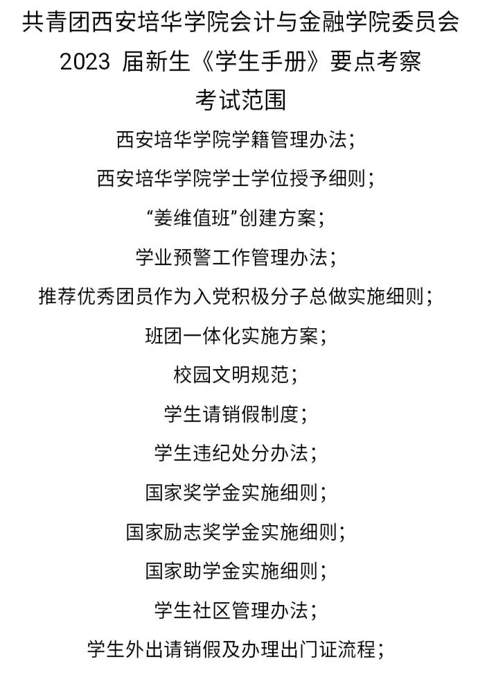 为引导2023届新生尽快熟悉学校规章制度,养成良好的行为规范,做到讲规矩、明纪律、守底线,我院将组织2023届新生进行《学生手册》要点考察。主要考核方式为闭卷考核,考试题型包括填空题、选择题、判断题、简答题、大题(流程题、开放性题)。考试内容如下图所示: