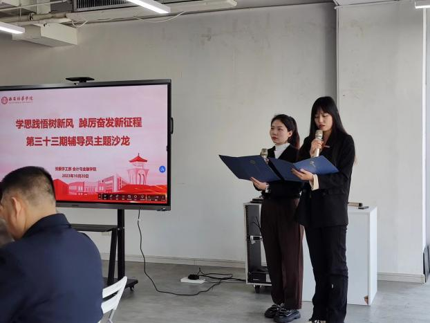 习近平总书记强调,学风问题是关系党的事业兴衰成败的一个重大政治问题。一所高校的校风和学风,犹如阳光和空气决定万物生长一样,直接影响着学生学习成长。因此为减少和杜绝目前存在的学生迟到、旷课、留降级、考试违纪等现象发生,进一步加强学风建设,减少补考、重修、留降级学生人数,提高学校学生学习成绩、四六级通过率、各类资格证书获取率、社会实践参与率、各类大赛的参加率与获奖率,帮助学生树立热爱学习、坚持学习、终身学习的观念,进一步提升我校学生的“六率”,会计与金融学院于2023年10月20日下午14:30分在创客中心二楼召开了以“学思践悟树新风,踔厉奋发新征程”为主题的第三十三期辅导员主题沙龙。